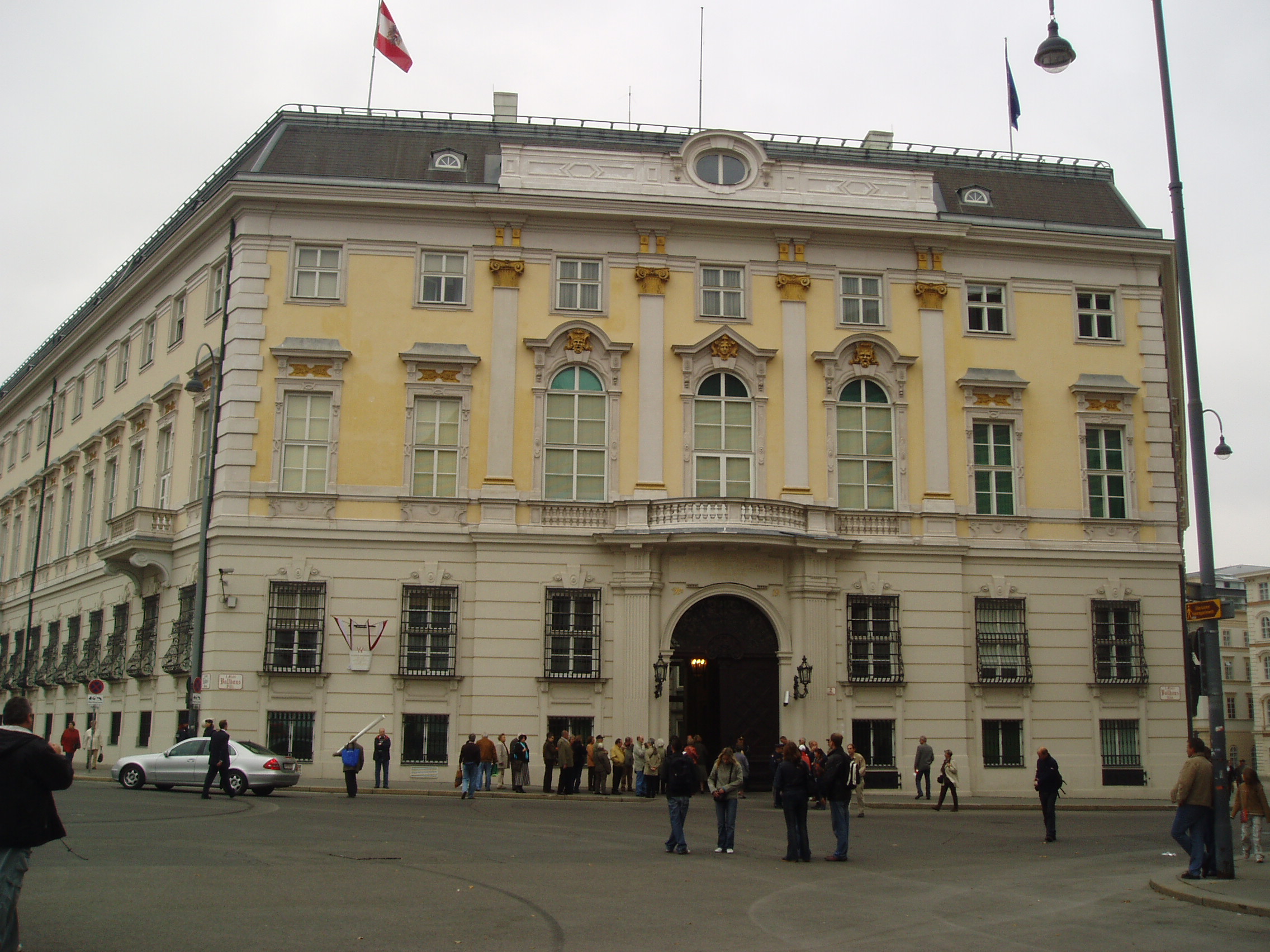 Nyilvános 1669 | 3625 | Ballhausplatz 2. Kancellári palota | A tér arról a régen lebontott bálházról kapta a nevét, amelyet a térbe torkolló Schauflergasse sarkán az 1525-ben Spanyolországból átvett "bál"-játékok megrendezésére I. Ferdinánd császár épített. Kétszáz évvel később emelte Johann Lukas von Hildebrandt a képen látható palotát. Ebben politizált annakidején Kaunitz és Metternich kancellár, majd utódaik. Ebben az épületben ölték meg 1934-ben Dolfuss kancellárt. 1814-15-ben itt tárgyalt és táncolt a napóleoni háborúk után összeült kongresszus. Az itt megrendezett fényes bálokon Bihari János is muzsikált. |