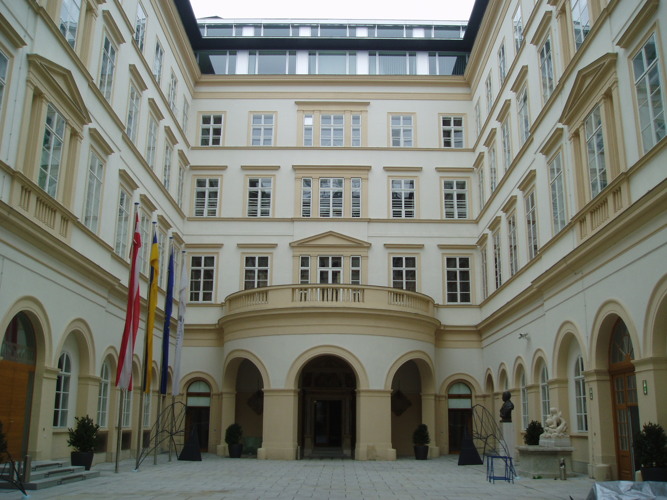 Nyilvános 1644 | 3449 | Herrengasse 13. Landhaus (a régi országház) belső udvara | A hatalmas palota építési ideje nem ismert, de az 1500-as években már állt. Azóta többször átépítették, jelenlegi klasszicista köntösét 1832-48 között kapta. Ebben a palotában ült össze évszázadokon keresztül, I. Miksa uralkodása óta az alsó-ausztriai rendi gyűlés. Ma az alsó-ausztriai kormány hivatala. Klasszicista Festsaal-ja (ünnepi terem) nevezetes hangversenyek színhelye volt. Falai között megfordult Schubert, Beethoven, s itt adta első bécsi koncertjét egy 12 éves magyar csodagyermek, Liszt Ferenc. |