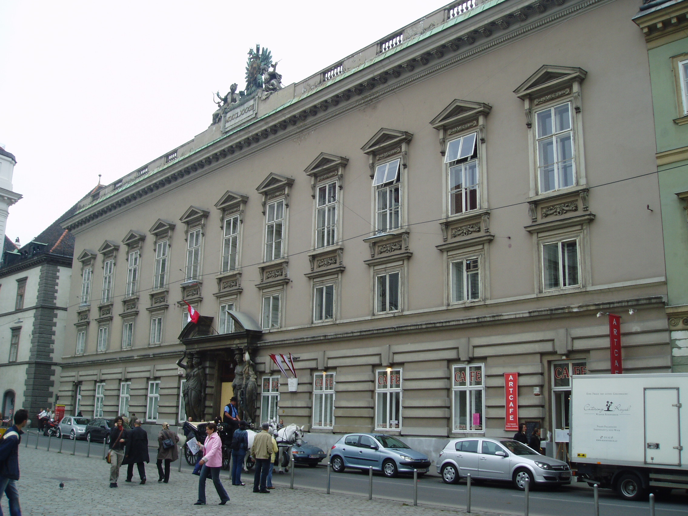 Nyilvános 1294 | 2031 | Josefsplatz 5. Pallavicini-palota | Az olasz származású Pallavicini őrgrófi család palotája helyén a középkorban zárda állt. Az omladozó épületet egy kalandos életű kereskedő, Johann Fries szerezte meg, s ő építtette át 1783-84 között Ferdinand von Hohenberg udvari építésszel. Fries – Kaunitz kancellár bizalmából – diplomáciai küldetéseket is végzett, érdemei elismeréseképpen birodalmi grófi címet kapott. Fia, Moritz von Fries báró pedig már Mozart és Beethoven mecénásai közé tartozott; mindkét művész gyakran szerepelt estélyein, Beethoven pedig neki ajánlotta VII. szimfóniáját. |
