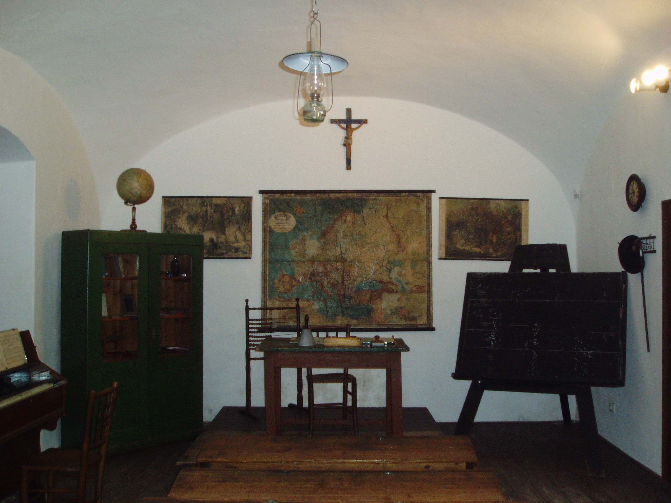 Nyilvános 1209 | 1973 | Tapolca: Templom domb 8. Múzeum | A múzeum épülete, az ún. Kántorház - a város védett építészeti emléke - Tapolca történelmi városközpontjában, a Malom-tó fölötti Templom dombon található. Ide járt elemi iskolába a város nagy szülötte, Batsányi János költő. Az épületben 1733-tól 1884-ig folyt az elemi iskolai oktatás. A múzeum iskolatörténeti kiállításának reprezentatív része a régi tanterem.. A maximális életszerűségre való törekvés jegyében a tanteremből szinte csak az iskolamester és a gyerekek hiányoznak. Az ajtótól jobbra fogasra akasztva a tanító úr kalapja és sétapálcája, a katedrán nyitva az 1900-as évek elejéről származó osztálykönyv. A falakon természettudományi, szám- és mennyiségtani szemléltető képek, s magyar történelmi események ábrái a tatárjárástól 1848/49-ig. A tanítói pulpitus mögött nagyméretű Európa-térkép függ, melyet Kogutowicz Manó készített 1893-ban. Az iskolai szekrényekbe bepillantva régi tankönyvek, palatáblák, tintatartók láthatók. Annakidején az ilyen tantermekben általában osztatlan oktatási szisztéma alapján foglalkozott a tanulókkal a tanító, a segédtanító és a pedellus. Az iskolatörténeti kiállítás következő termében tanszer- és szemléltetőeszköz-történeti tárlat tekinthető meg. A felvétel 2007 februárjában készült. Felh. irod.: Látnivalók Veszprém megyében. Miskolc, Well-PRess, 2000 Hangodi László: Múltbanéző - kiállításvezető a Tapolcai Városi Múzeum tárlataihoz. Tapolca, 2006 |
