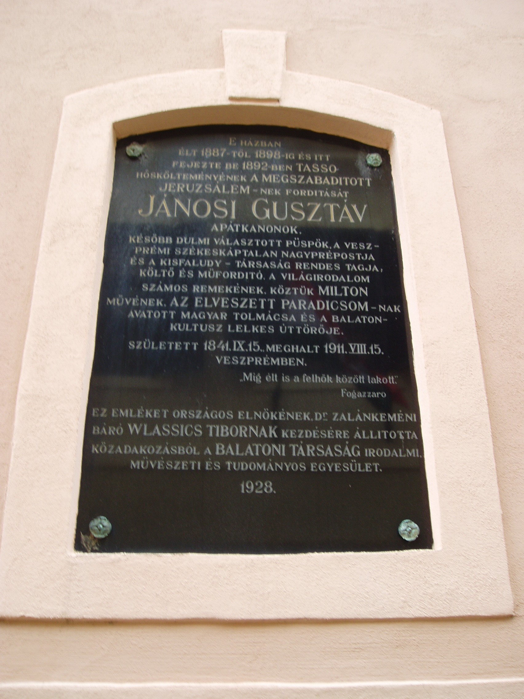 Nyilvános 1189 | 1868 | Veszprém, Vár utca 17. | Mint az épület falán 1928-ban elhelyezett emléktáblán is olvasható, itt élt 1887 és 1898 között Jánosi Gusztáv (1841-1911) apátkanonok, és itt fejezte be Tasso: A megszabadított Jeruzsálem c. eposzának fordítását. Lefordította Milton Elveszett paradicsomát is. (Ha legközelebb Veszprémben járok, az épületet is lefényképezem! K. K.) A felvétel 2005 augusztusában készült. |