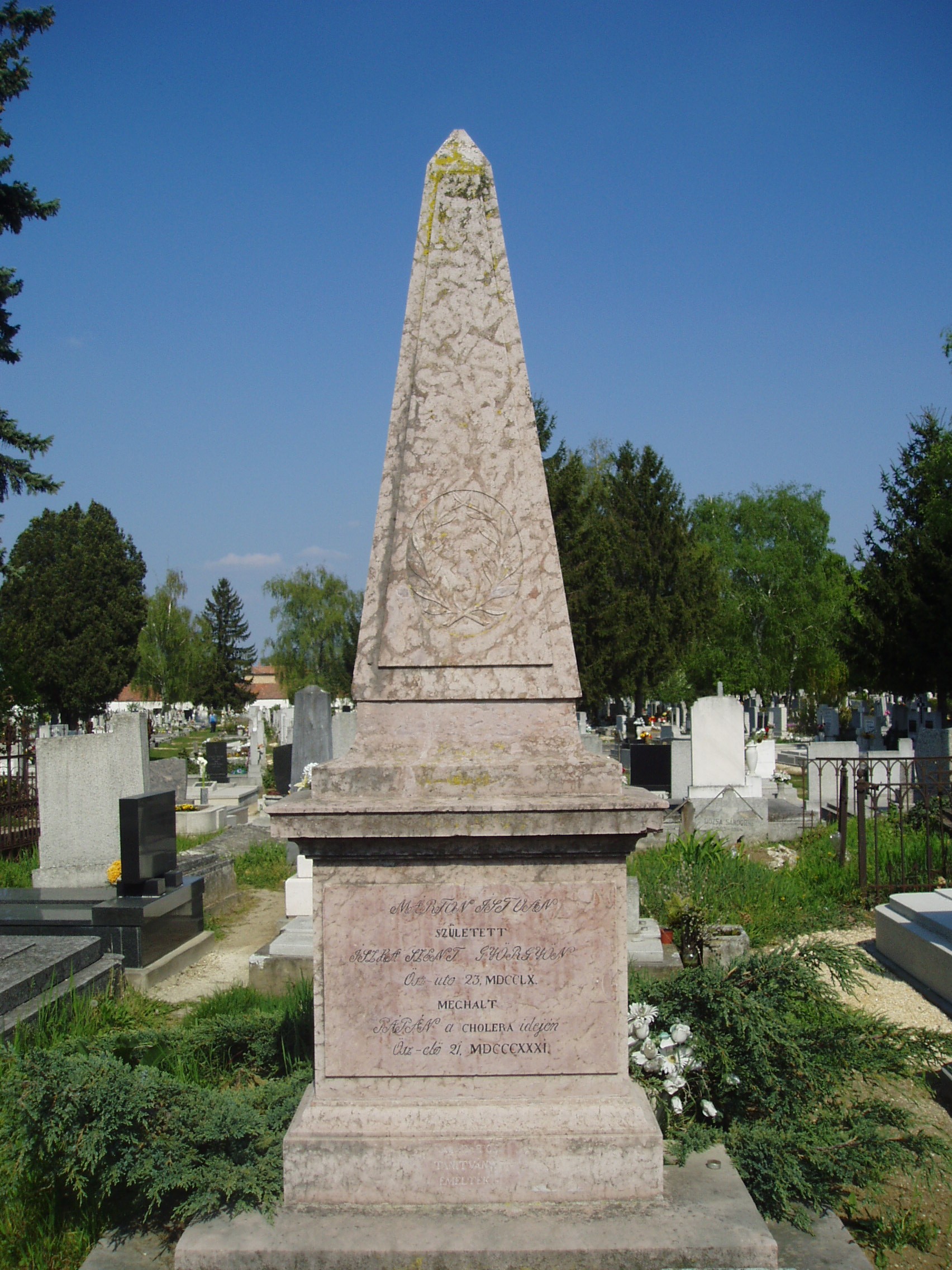Nyilvános 1445 | 4038 | Pápa, Alsóvárosi temető: Mándi Márton István sírja | A Jókai utcáról nyíló Temető utca vezet a XIX. század elején megnyílt Alsóvárosi köztemetőbe. A város sok neves személyiségének van itt a sírja. Itt nyugszik Mándi Márton (Iszkaszentgyörgy, 1760. nov. 23. – Pápa, 1831. szept. 21.) nyelvész, tanár, filozófus. Kecskeméten, Debrecenben, majd Göttingában tanult. 1790-től volt a pápai református gimnázium rektor-professzora. Nevéhez fűződik az iskola új fellendülése. A filozófiában Kant követője volt és 1795-ben már Kant tanítása alapján tartott előadásokat, amelyekért súlyos bírálat érte. Márvány mellszobra, Izsó Miklós alkotása a református könyvtárban látható (Pápa, Március 15. tér 9.). A városban utcanév, az Ókollégium (Petőfi S. utca 13.) falán tábla őrzi emlékét. A fénykép 2007 áprilisában készült. Felh. irod.: Németh Adél - Szabó Lajos: Pápa. Bp. Panoráma, 1989 Veszprém megyei életrajzi lexikon. Veszprém, Veszprém Megyei Önkormányzat Közgyűlése, 1998 |