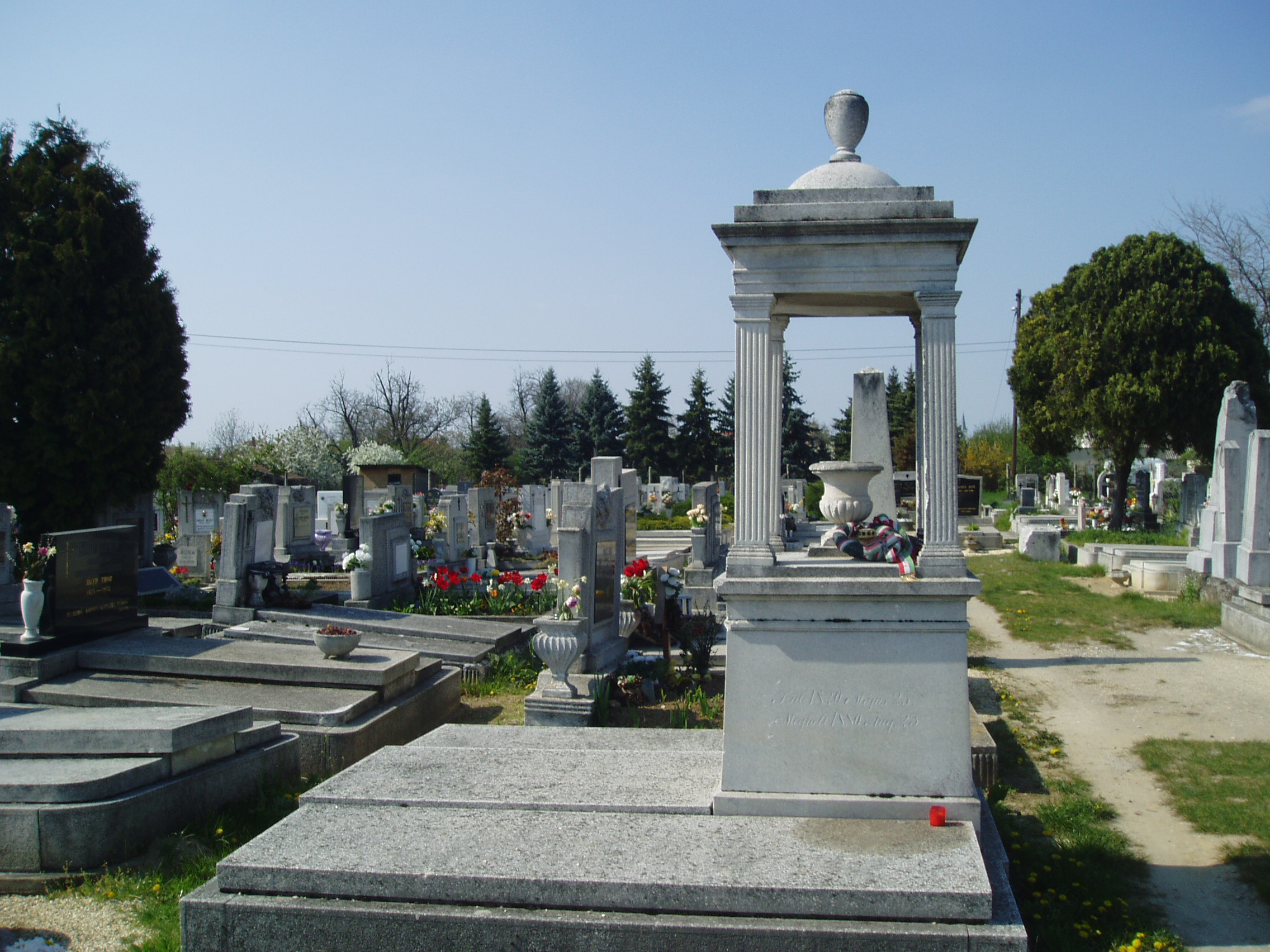 Nyilvános 1516 | 3890 | Pápa, Alsóvárosi temető: Bocsor István sírja | A Jókai utcáról nyíló Temető utca vezet a XIX. század elején megnyílt Alsóvárosi köztemetőbe. A város sok neves személyiségének van itt a sírja. Itt nyugszik Bocsor István (Enying, 1807. okt. 18. – Pápa, 1885. jún. 3.) író, tanár. Enyingi jobbágycsalád sarja. 1819-1832 között Pápán tanult, a református főiskolán teológiai és jogi képesítést nyert, majd 1837-től tanított. Magyar nyelvű történelemórái a város közönségére is nagy hatást gyakoroltak. 1848-ban az enyingi kerület nemzetgyűlési képviselője volt. A szabadságharc bukása után visszavonultan, tanári munkásságának élt. Alakját Kozma Andor: A karthágói harangok c. versében örökítette meg. Latin nyelvtana öt kiadást ért meg. Pápán a Széchenyi u. 10. sz. házon – ahol lakott – emléktáblája, a Dunántúli Ref. Egyházkerület Könyvtárában (Pápa, Március 15. tér 9.) mellszobra van. Radikalizmusáról tanúskodó, előadásait tartalmazó Világtörténelem (1841) című, illetve Középkori történetek (1863–1864.) című kézirata is ebben a gyűjteményben található. A fénykép 2007 áprilisában készült. Felh. irod.: Németh Adél - Szabó Lajos: Pápa. Bp. Panoráma, 1989 Veszprém megyei életrajzi lexikon. Veszprém, Veszprém Megyei Önkormányzat Közgyűlése, 1998 |