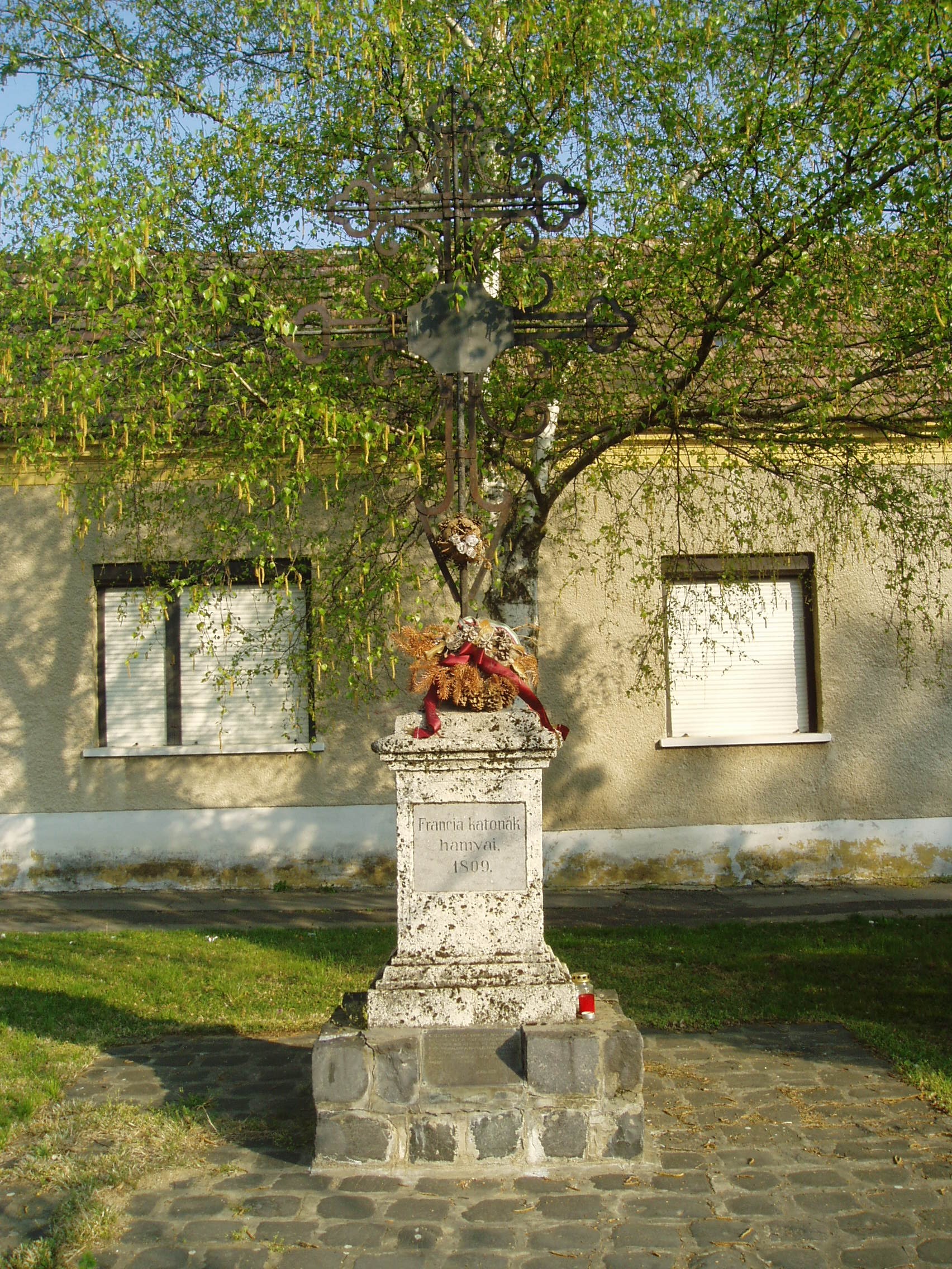 Nyilvános 1269 | 2192 | Pápa, Anna tér: Francia kereszt | Az Anna tér az egykori Alsóváros településközpontja. A tér dombján álló Szent Anna kápolna 1875-ben épült. A közelében található ún. Francia kereszt a napóleoni háború francia halottainak egykori tömegsírja felett áll. Pápát 1809. június 1. és július 6. között megszállva tartották a franciák. A hátrahagyott, majd később idehozott sebesültek ápolásáról a városnak és a megyének kellett gondoskodni. Egyes források szerint több, mint 5000 sebesültet ápoltak a városban, akik közül sokan belehaltak sérüléseikbe. Őket itt, az Anna téren temették el. Hamvaik a temető felszámolása után az Alsóvárosi temetőbe kerültek a kettős vaskereszttel együtt, amelyet 1986-ban állítottak vissza eredeti helyére. A fénykép 2007 áprilisában készült. Felh. irod.: Németh Adél - Szabó Lajos: Pápa. Bp. Panoráma, 1989 |
