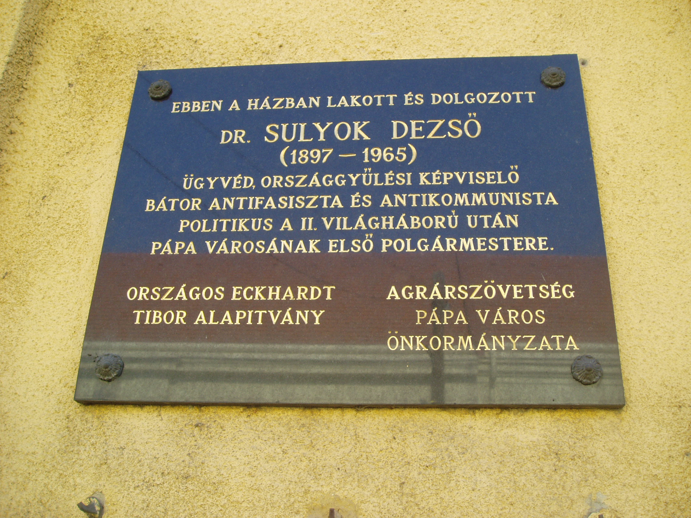 Nyilvános 1228 | 1967 | Pápa, Batthyány utca 3. | Mint az épület homlokzatán olvasható emléktábla tanúsítja, ebben a házban élt és dolgozott Sulyok Dezső ügyvéd, országgyűlési képviselő, Pápa első polgármestere a második világháború után. Sulyok Dezső (Simaházapuszta, 1897. márc. 28. – New York, 1965. máj. 18.) politikus, jogász. 1919–1920-ban – a Tanácsköztársaság idején is – Pápán, csendőrhadnagyként a helyi karhatalom parancsnoka volt, majd kilépett a csendőrségtől, Budapesten szerzett jogtudományi oklevelet. 1924-ben Pápán ügyvédi irodát nyitott. Jelentős szerepet játszott a város közéletében: elnöke volt a Katolikus Körnek, ügyésze a Hitelbank pápai fiókjának. 1935-ben országgyűlési képviselő lett előbb pártonkívüli, majd kisgazdapárti programmal. A második világháborúban a Donnál harcolt. 1943-tól a FKgP polgári tagozatának társelnöke. Náciellenes magatartása miatt 1944. április 3-án letartóztatták, két hónapra internálták. 1945-ben, áprilistól szeptemberig Pápa város első polgármestere, egyben rendőrkapitánya, és a Független Kisgazda Párt jobbszárnyának, a Sulyok–Vásáry csoportnak egyik vezetője volt. 1945. júniustól 1946. márciusig Veszprém megye országgyűlési képviselője. 1946-ban, a pártelnöki tanács 20 társával együtt kizárta a FKgP-ből, de mandátumát megtarthatta. Magyar Szabadság Párt néven új pártot alapított, amely fél évig működhetett csak. Elhagyta az országot és az Amerikai Egyesült Államokban élt, jelentős szerepet vállalva a politikai emigrációban. A fénykép 2007 áprilisában készült. Felh. irod.: Németh Adél - Szabó Lajos: Pápa. Bp. Panoráma, 1989 Veszprém megyei életrajzi lexikon. Veszprém, Veszprém Megyei Önkormányzat Közgyűlése, 1998 |