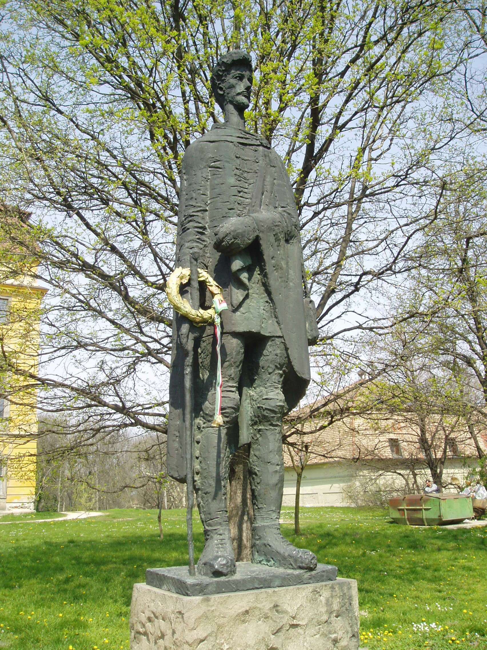 Nyilvános 1252 | 3168 | Pápa, Fő tér 1-3. Jókai-oszlop | Az Esterházy kastély előtti, a Fő tér felé néző parkban két egykori pápai diák - Jókai Mór és Petőfi Sándor - emlékére állított szoborkompozíció áll. A Petőfi Sándort megörökítő bronzszobor a szintén pápai diák Somogyi József szobrászművész alkotása. A fénykép 2007 áprilisában készült. Felh. irod.: Németh Adél - Szabó Lajos: Pápa. Bp. Panoráma, 1989 |