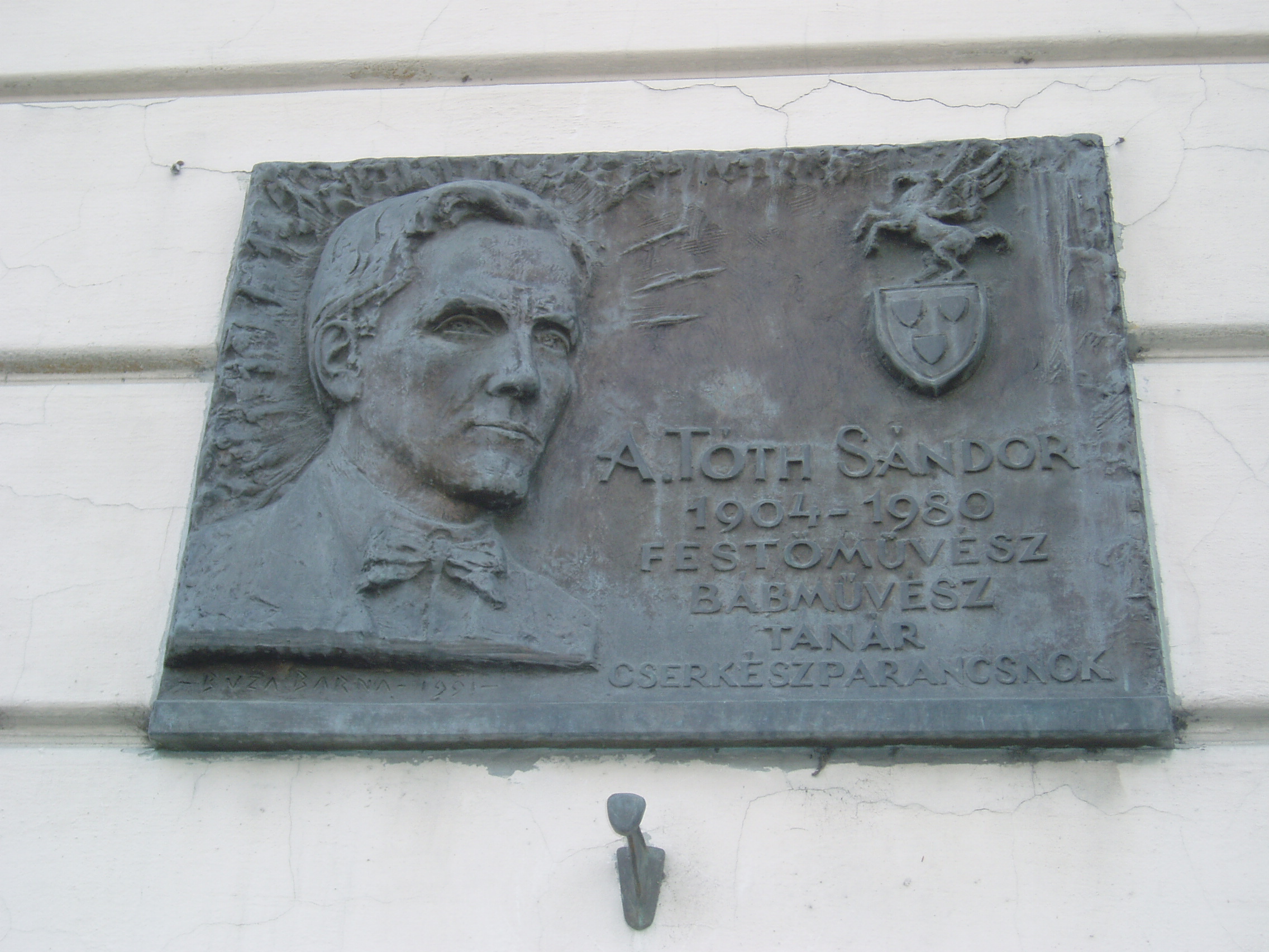 Nyilvános 1223 | 1944 | Pápa, Március 15. tér 9. Pápai Református Kollégium Gimnáziuma | A híres pápai Református Kollégium első épülete 1531 és 1752 között a mai Ruszek közben, a Lábasház épületének helyén állott. 1752-ben - Mária Terézia rendeletének következtében, amely megszüntette a szabad vallásgyakorlást - harminckét évig csak a közeli Adásztevelen működhetett. 1784-ben, II. József türelmi rendeletének köszönhetően térhetett vissza az iskola Pápára, s hamarosan felépült a ma Ókollégiumként ismert épület (lásd: Pápa, Petőfi u. 13.), amelyben 1794-ben indulhatott meg az oktatás. Az intézmény 1857-ig működött ott, ekkor átköltözött a Március 15. tér 13-15. számú házba, az ún. Nátus-ba, majd 1895-ben utolsó végleles helyére, ide, a Március 15. tér 9. számú monumentális új épületbe. A képen A. Tóth Sándor (1904-1980) emléktáblája látható, Búza Barna alkotása. A. Tóth Sándor az államosítás előtti években franciát, rajzot és ábrázoló geometriát tanított a gimnáziumban. Később a képzőművészeti főiskola tanára lett, és bábművészként is ismert volt. A fénykép 2007 áprilisában készült. Felh. irod.: Németh Adél - Szabó Lajos: Pápa. Bp. Panoráma, 1989 http://refi-papa.hu |