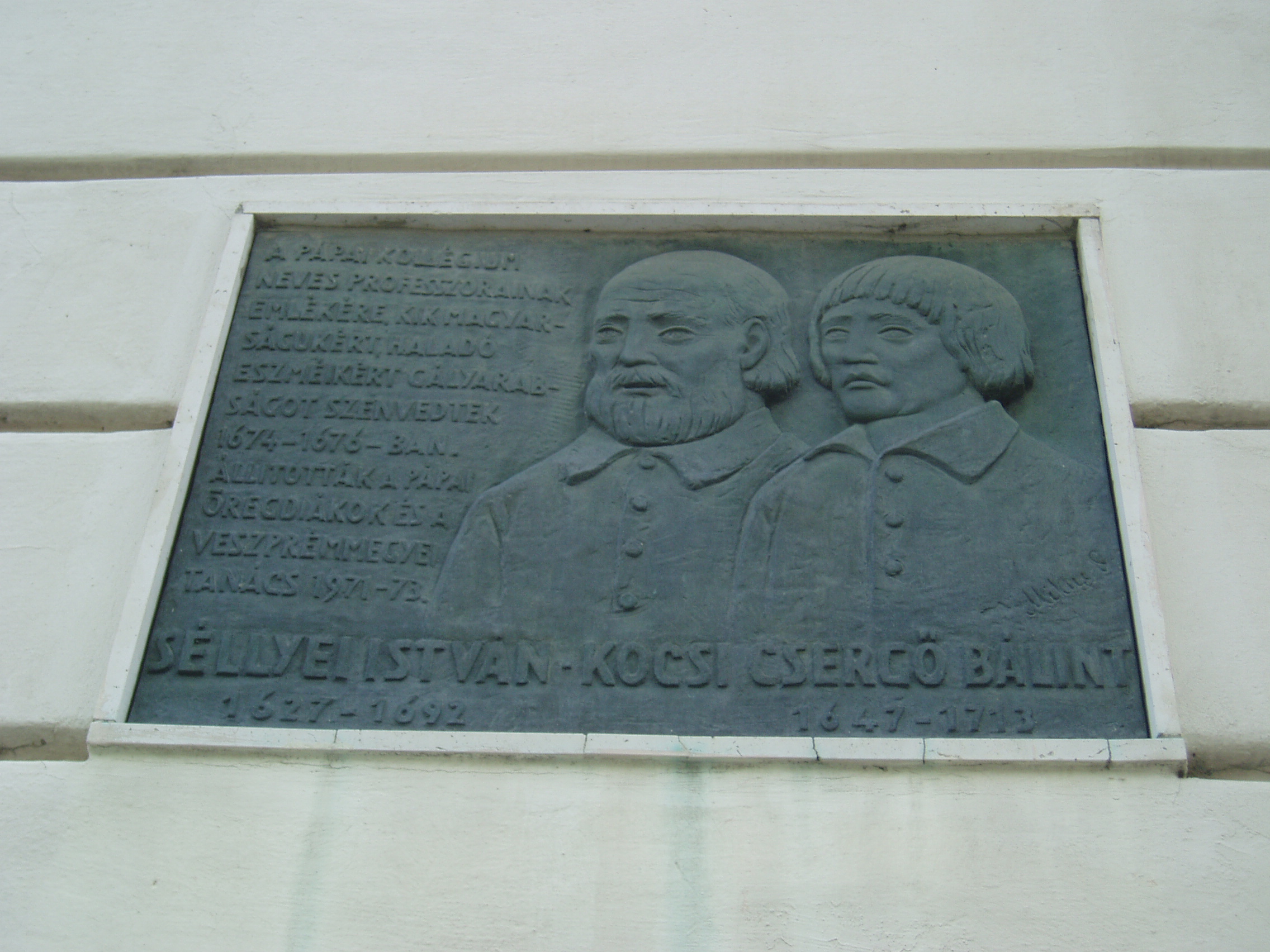 Nyilvános 1163 | 1881 | Pápa, Március 15. tér 9. Pápai Református Kollégium Gimnáziuma | A híres pápai Református Kollégium első épülete 1531 és 1752 között a mai Ruszek közben, a Lábasház épületének helyén állott. 1752-ben - Mária Terézia rendeletének következtében, amely megszüntette a szabad vallásgyakorlást - harminckét évig csak a közeli Adásztevelen működhetett. 1784-ben, II. József türelmi rendeletének köszönhetően térhetett vissza az iskola Pápára, s hamarosan felépült a ma Ókollégiumként ismert épület (lásd: Pápa, Petőfi u. 13.), amelyben 1794-ben indulhatott meg az oktatás. Az intézmény 1857-ig működött ott, ekkor átköltözött a Március 15. tér 13-15. számú házba, az ún. Nátus-ba, majd 1895-ben utolsó végleles helyére, ide, a Március 15. tér 9. számú monumentális új épületbe. A képen látható dombormű Séllyei István (1669-1692) gályarab prédikátor, dunántúli püspök, valamint Kocsi Csergő Bálint (1647-1711), szintén gályarabságra ítélt író, lelkész, tanár emlékét őrzi. Miután Ruyter holland tengernagy segítségével (lásd még: Debrecen, Emlékkert: Gálayarabok emlékoszlopa) kiszabadultak még életben lévő társaikkal együtt, hazatérve fellendítették az iskolát. Az emléktábla Mikus Sándor alkotása. A fénykép 2007 áprilisában készült. Felh. irod.: Németh Adél - Szabó Lajos: Pápa. Bp. Panoráma, 1989 http://refi-papa.hu |