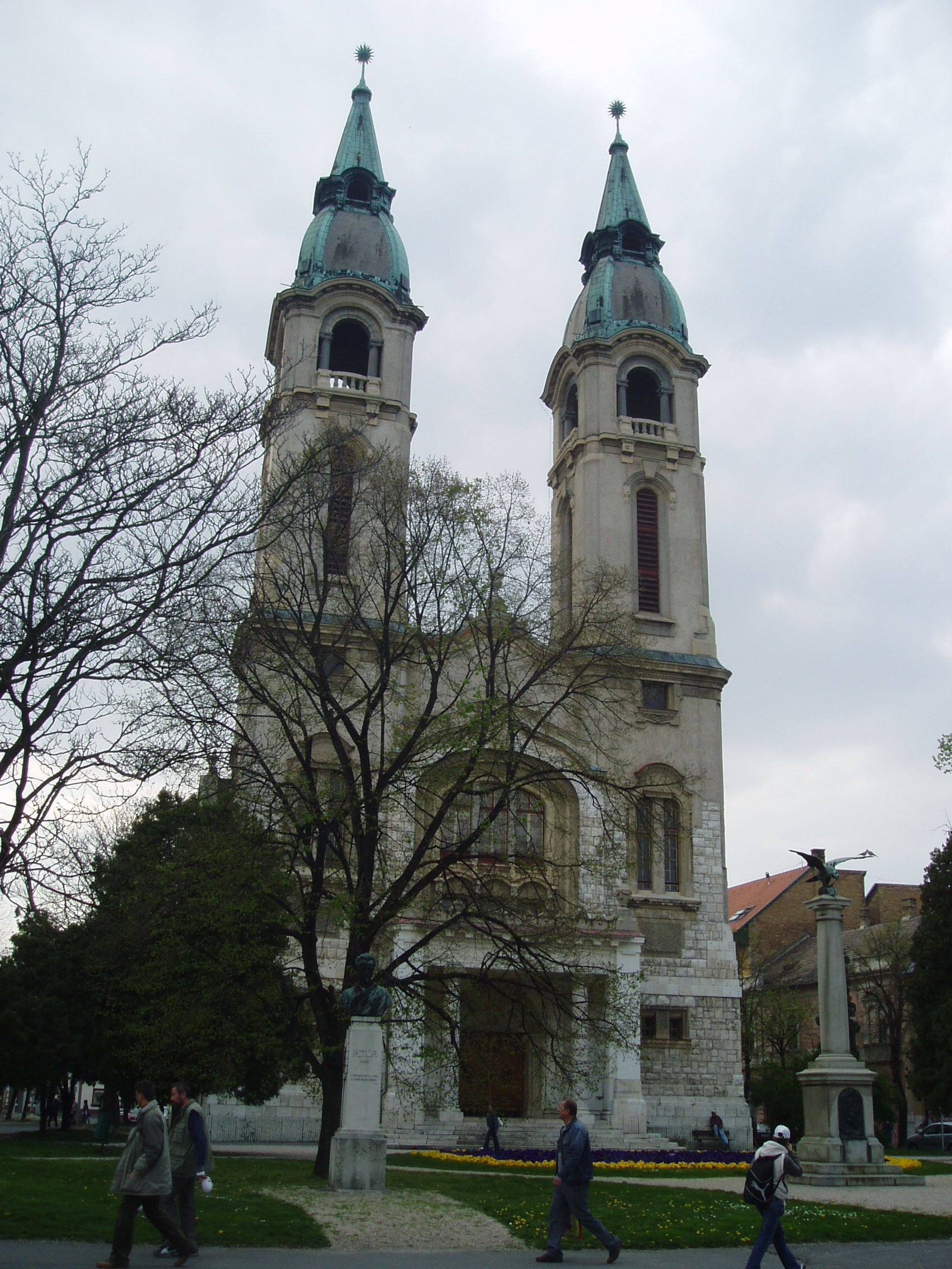 Nyilvános 1222 | 1841 | Pápa, Március 15. tér: Református nagytemplom | A templom a Március 15. tér közepén emelkedik, az 1931-ben lebontott Jókai Színház helyén. 1881 és 1930 között itt állt Pápa első állandó színháza. Korábban — az 1800-as évek elejétől — a színházi előadásokat a Griff szálló nagytermében (lásd: Pápa, Fő tér 15.) tartották. Ünnepélyes avatását 1881. december 7-én tartották; a prológ megírására az egykori pápai diákot, Jókai Mórt kérték fel. A színháznak nem volt állandó együttese, épületében évente több színtársulat is megfordult. A színház csillagos órái közé tartozott Blaha Lujza néhány vendégszereplése. Prielle Kornélia is játszott vendégként a színpad deszkáin. 1905-ben valóságos láz tört ki a városban, amikor Pálmay Ilka operettdalokkal vendégszerepelt a színházban. A pápai kőszínház fennállásanak évtizedei alatt olyan híres prózai színészek is megfordultak itt vendéként, mint Jászai Mari és Márkus Emília. Lebontása előtt az utolsó előadás főszerepét Beregi Oszkár játszotta. 1906-ban a református egyház azzal az igénnyel lépett fel, hogy a színház helyén templomot építhessen. Sok vita után és megfelelő anyagi kártérítés kikötésével a város 1910-ben helyt adott a kérésnek, de a templom csak 1931-34 között épült fel Dudás Kálmán budapesti építész tervei alapján (az új színházépület viszont évtizedekkel később, az 1970-es évek végén nyílt meg a Köztársaság ligetben). A neobarokk stílusú, kéttornyos, monumentális templom a tér hosszanti irányában helyezkedik el. Főhomlokzatán az oszlopos, erkélyes főbejárat felett íves oromzat köti össze a kétrészes sisakkal fedett tornyokat. A fénykép 2007 áprilisában készült. Felh. irod.: Németh Adél - Szabó Lajos: Pápa. Bp. Panoráma, 1989 Nádasdy Lajos: A pápai kőszínház története 1817-1931. Veszprém, Veszprém Megyei Tanács, 1981 |