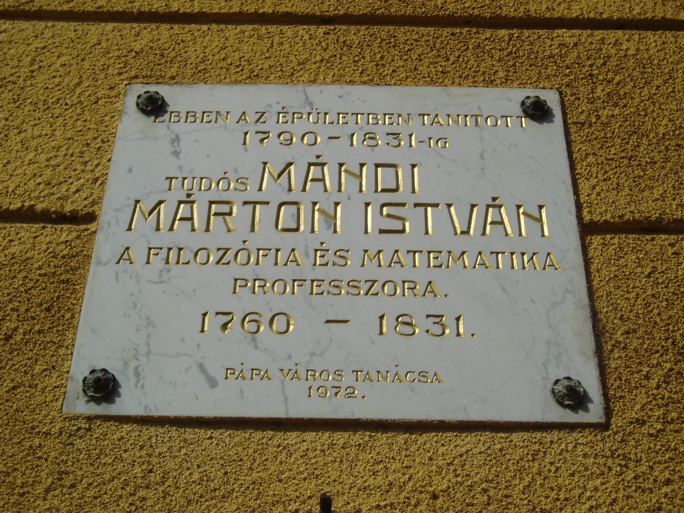 Nyilvános 1206 | 2008 | Pápa, Petőfi utca 13. Ókollégium | A híres pápai Református Kollégium első épülete 1531 és 1752 között a mai Ruszek közben, a Lábasház épületének helyén állott. 1752-ben - Mária Terézia rendeletének következtében - harminckét évig csak a közeli Adásztevelen működhetett. 1784-ben, II. József türelmi rendeletének köszönhetően térhetett vissza az iskola Pápára, s hamarosan felépült a később Petőfi Sándorról elnevezett utcában a most látható épület, amelyben 1794-ben indulhatott meg az oktatás. A jelentős tömegű, szögben megtörő késő barokk épület kimagaslik az utca XVIII-XIX. századi alacsony épületei közül. Homlokzatkiképzése egyszerű. Az épületbelsőben hangulatos, szűk folyosók és boltozatos szobák idézik a régi diákélet hangulatát. A főbejárat felett emléktábla örökíti meg egykori híres tanárainak és tanulóinak nevét. Az épületben tanított Mándi Márton István professzor. Ő volt az első Magyarországon, aki Kant filozófiáját - ebben az épületben - tanította. Az ő neéhez fűződik az adászteveli száműzetés után az iskola nagy fellendülése. A XIX. században híres tanárai voltak Tarczy Lajos és Bocsor István. Tarczy hirdette először Magyarországon katedráról a hegeli eszméket, amiért később le is kellett mondania a filozófia tanszékről. Ő volt a híres Képzőtársaság (az iskola önképzőköre) első elnöke. Egyénisége maradandó hatással volt irodalmunk számos későbbi kiválóságára, Petőfire, Jókaira, Eötvös Károlyra. (Lásd még: Pápa, Alsóvárosi temető; Pápa, Jókai u. 26.). Bocsor István 1837-től tanított itt. Magyar nyelvű történelemórái a város közönségére is nagy hatást gyakoroltak. A szabadságharc bukása után visszavonultan, tanári munkásságának élt. Alakját Kozma Andor: A karthágói harangok c. versében örökítette meg. (Lásd még: Pápa, Alsóvárosi temető; Pápa, Széchenyi u. 10.). Jeles tanár volt rajtuk kívül Váli Ferenc, Jókai Mór sógora (lásd még: Pápa, Alsóvárosi temető; Pápa, Jókai u. 20.). Ide járt iskolába az 1841/42-es tanévben Petőfi Sándor és Jókai Mór. Különösen Petőfi életében jelentett döntő momentumot az itt eltöltött időszak (lásd még: Pápa, Petőfi u. 11., Pápa, Jókai u. 13.). Az épületben tanult még Orlai Petrich Soma, Thaly Kálmán, Eötvös Károly, Kozma Sándor és mások. Az intézmény 1857-ig működött ezen a helyen, ekkor átköltözött a Március 15. tér 13-15. számú házba, az ún. Nátus-ba, majd 1895-ben utolsó végleles helyére, a Március 15. tér 9. számú monumentális épületébe. Az egykori Ókollégium ma (2007) gimnazista lányok diákotthona. Itt található a pápai születésű (lásd: Pápa, Március 15. tér 8.) Rab Zsuzsa költő és a Pápán is diákoskodott Hegyi Imre néprajztudós könyvtára. Rab Zsuzsa még életében adományozta könyvtárának jelentős részét a pápai alma maternek, míg Hegyi Imre könyvtára özvegye révén került a Református Gimnázium tulajdonába. A fénykép 2007 áprilisában készült. Felh. irod.: Németh Adél - Szabó Lajos: Pápa. Bp. Panoráma, 1989 Pápa. Szerk. Sz. Farkas Aranka. 2. kiad. Veszprém - Bp., Magyar Képek, 2000 |