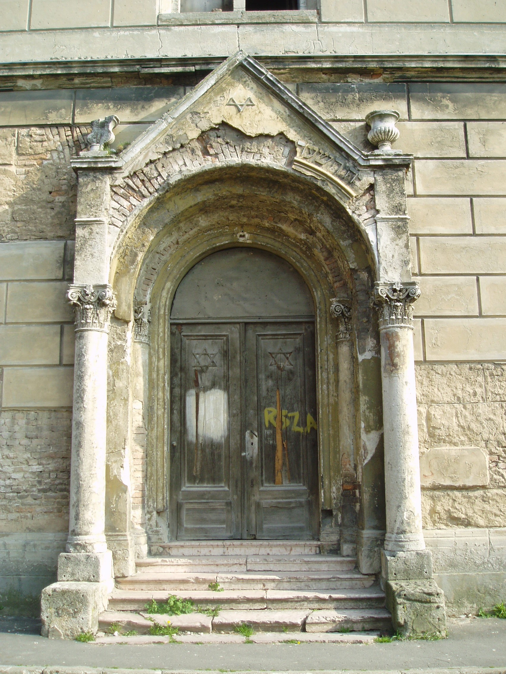 Nyilvános 1206 | 1860 | Pápa, Petőfi utca 21. Zsinagóga | A napjainkig eredeti formában fennmaradt zsinagóga építését 1844-ben kezdték el. A 398 m2 alapterületű, közel 20 méter magas épületet Löw Lipót rabbi szentelte fel 1846-ban. A főbejárat a vallási előírásoknak megfelelően a nyugati oldalon található. A zsinagóga puritán külső megjelenését csak a félköríves fülkékbe helyezett romantikus ikerablakok és a klasszicizáló oldalkijárat díszíti. A kétszintes karzatszerkezettel rendelkező, dekoratívan festett belső térben nyolcszáz férfi számára volt ülőhely. Az épület jelenleg (2007) rendkívül elhanyagolt állapotban van, felújításra vár. A fénykép 2007 áprilisában készült. Felh. irod.: Németh Adél - Szabó Lajos: Pápa. Bp. Panoráma, 1989 www.papa.hu |