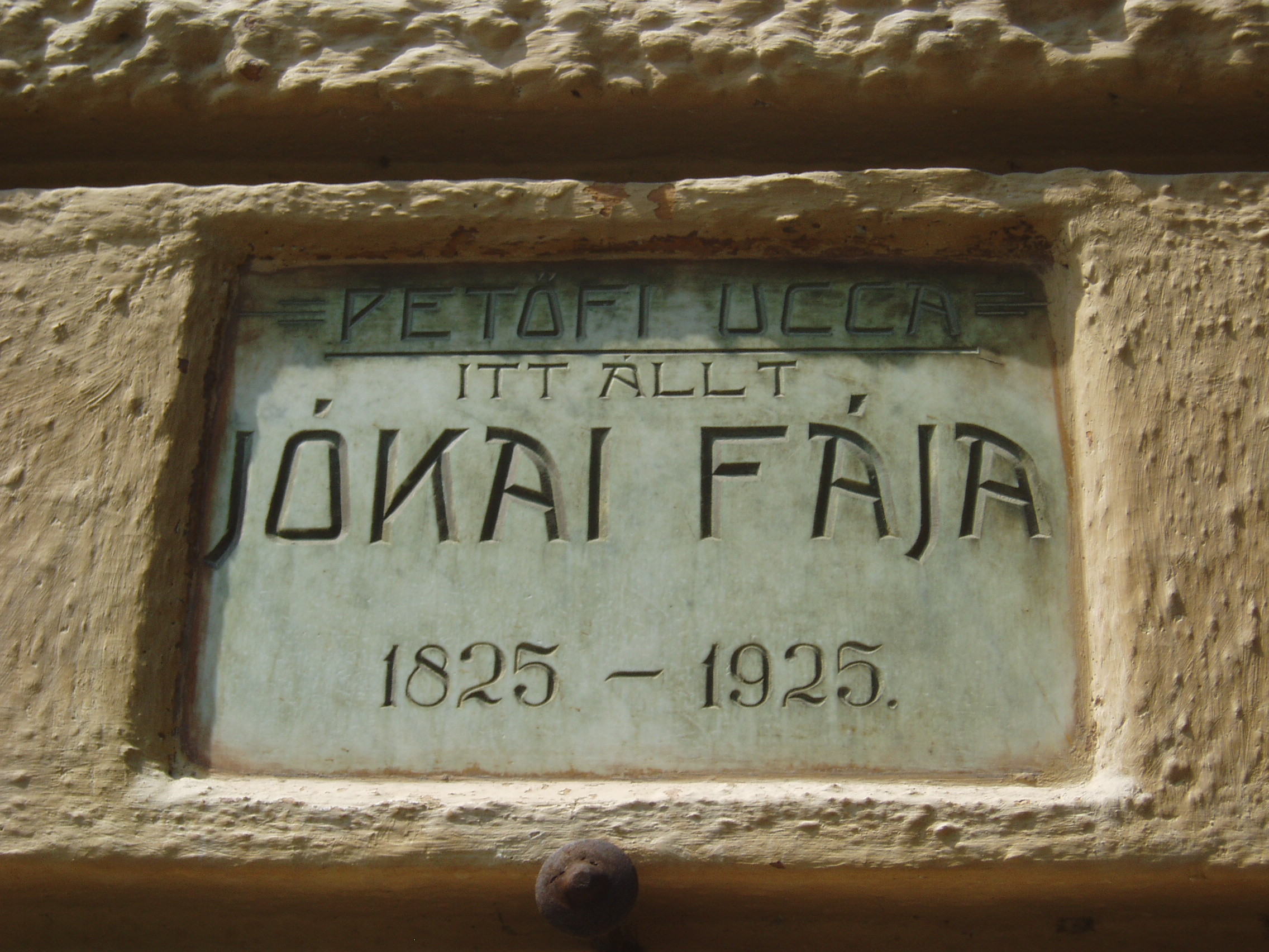 Nyilvános 1175 | 2090 | Sümeg, Kossuth utca 13. | A Kisfaludy szálló épületén a következő rejtélyes emléktábla olvasható: "Petőfi ucca. Itt állt Jókai fája 1825-1925". A források szerint Jókai 1857 nyarán járt Sümegen egy nagyobb kirándulás keretében. Füreden szállt meg, majd Tihanyba és Keszthelyre látogatott. Bejárta és lerajzolta a Balaton-felvidéki várromokat, Sümegen felkereste Kisfaludy Sándor sírját. Minderről be is számol a Magyar hon szépségei című könyvében. De hogy az egykor itt állott fa milyen történetet takar, annak eddig nem jutottam nyomára. A fénykép 2007 júniusában készült. |