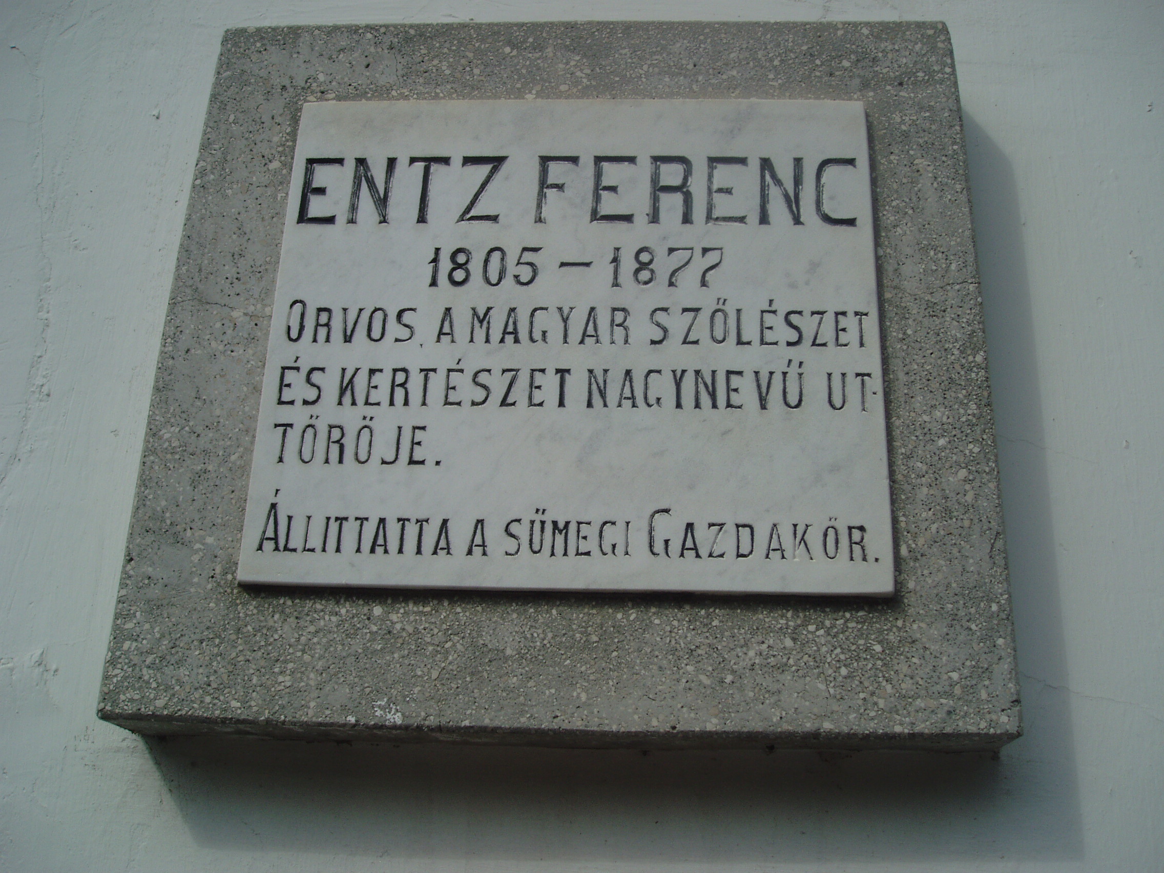 Nyilvános 1136 | 1723 | Sümeg, Panteonfal. Entz Ferenc emléktáblája | A Kisfaludy téren, Kisfaludy Sándor szülőháza előtt alakították ki Sümeg Panteonfalát. A képen Entz Ferenc emléktáblája látható (1955). Felirata: ENTZ FERENC 1805-1877 Orvos, a magyar szőlészet és kertészet nagynevű úttörője. Állíttatta a Sümegi Gazdakör Entz Ferenc (Sümeg, 1805. dec. 6. – Promontor–Budafok, 1877. máj. 8.) orvos, szőlész, kertész. A szabadságharcban honvéd főorvos volt, ezért Világos után eltiltották az orvosi tevékenységtől. Ekkor fordult a kertészet és szőlészet elméleti és gyakorlati kérdései felé. Megírta korának alapvető kertészeti szakkönyvét. Nagy érdeme a kertészeti műnyelv kialakítása, amelyre a mai kertészeti szaknyelv is épül. 1853-ban Pesten létrehozta az első magyar kertészképző iskolát. Sümegi szülőházán is helyeztek el emléktáblát (lásd: Sümeg, Ramassetter u. 6.). A fénykép 2007 júniusában készült. Felh. irod.: Koppány Tibor - Kozák Károly: Sümeg útikalauz. Veszprém, Idegenforgalmi Hivatal, 1965 Látnivalók Veszprém megyében. Miskolc, Well-PRess, 2004 Veszprém megyei életrajzi lexikon. Veszprém, Veszprém Megyei Önkormányzat Közgyűlése, 1998 www.ekmk.hu/emlekhely/Emlekhelyek.html |