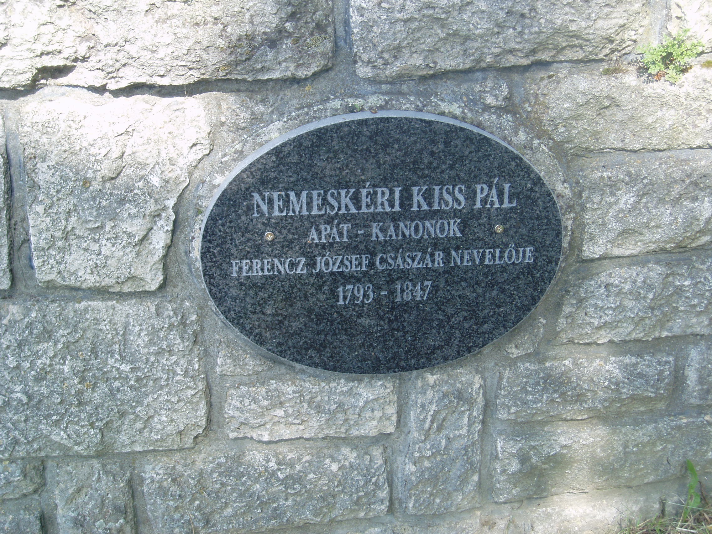 Nyilvános 1183 | 2236 | Sümeg, Temető. Nemeskéri Kiss Pál sírja | Sümeg délkeleti határában, a Tapolcára vezető út mellett emelkedő lankás domboldalon találjuk a város köztemetőjét. Helyét még Bíró Márton püspök jelölte ki; jelentősebb számban a XIX. század eleje óta kezdtek ide temetkezni. A temetődomb tetején áll az 1816-ban épített, későbarokk stílusú temetőkápolna. Körülötte a sümegi élet utolsó két évszázada szinte valamennyi híres személyiségének sírja fellelhető. Nemeskéri Kiss Pál (1793-1847) ovális alakú sírfelirata a temetőkápolna melletti Kálvária oldalában befalazva található. Eredeti sírja a család itteni kriptájában volt, amelyet beépítettek a Tihanyból 1968-ban ide áttelepített Kálvária-szoborcsoport talapzatába. Nemeskéri Kiss Pált Győrben szentelték pappá. Az 1820-as évektől a bécsi Theresiánumban a magyar nyelv és irodalom tanára volt, magyar nyelvre tanította Ferenc Károly főherceg fiait, köztük Ferenc Józsefet, a leendő osztrák császárt és magyar királyt. 1840-ben nagyváradi kanonoknak, 1843-ban királyházi apátnak nevezték ki. A Magyar Tudományos Akadémia 1846-ban tiszteletbeli tagjának választotta. Kívánsága szerint temették el a sümegi családi kriptában. Néhány évvel halála előtt a még gyerek Ferenc József testvéreivel, Károly Lajossal és a később Mexikóban kivégzett Miksával látogatást tett Sümegen egykori tanáránál. A fénykép 2007 júniusában készült. Felh. irod.: Koppány Tibor - Kozák Károly: Sümeg útikalauz. Veszprém, Idegenforgalmi Hivatal, 1965 Sümegi kalauz. Sümeg, Sümegi Fórum Alapítvány, 1993 Miklósi-Sikes Csaba: Kőbe vésett történelem. A sümegi városi temetők története és sírjelei 1950-ig. Sümeg, Sümegi Fórum Alapítvány, 2002 Veszprém megyei életrajzi lexikon. Veszprém, Veszprém Megyei Önkormányzat Közgyűlése, 1998 |