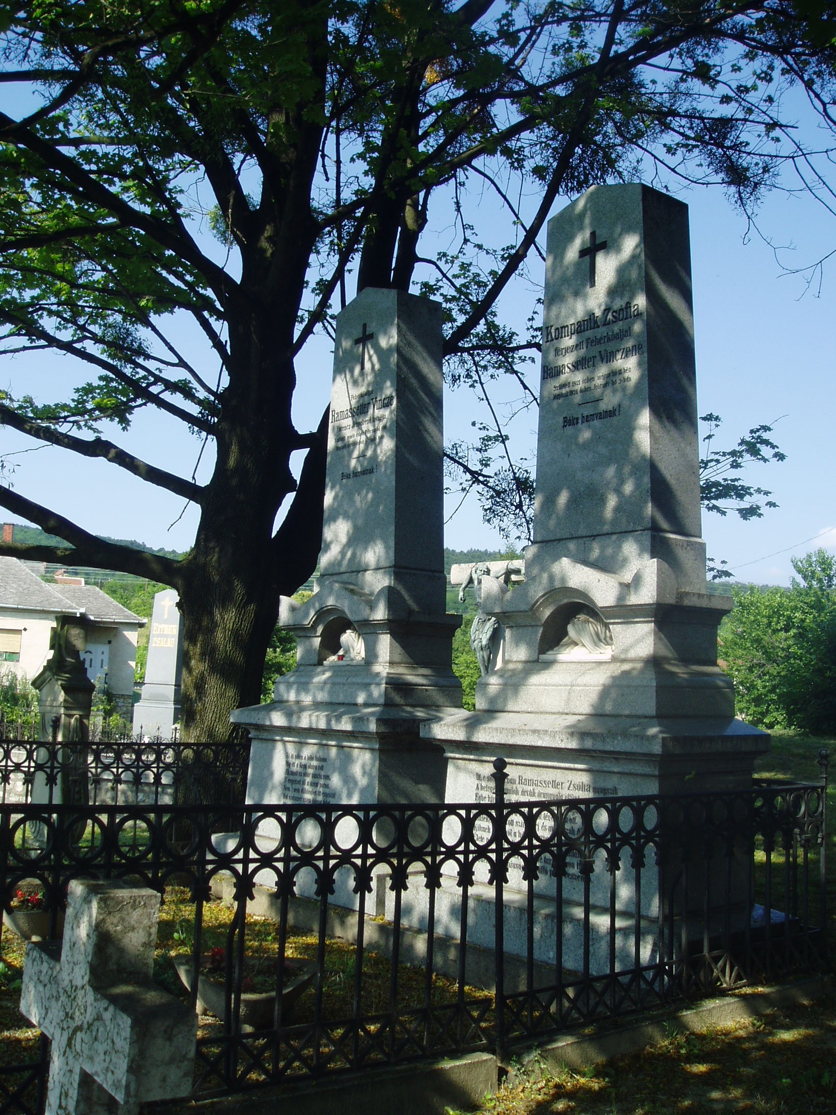 Nyilvános 1168 | 2242 | Sümeg, Temető. Ramassetter Vince sírja | Sümeg délkeleti határában, a Tapolcára vezető út mellett emelkedő lankás domboldalon találjuk a város köztemetőjét. Helyét még Bíró Márton püspök jelölte ki; jelentősebb számban a XIX. század eleje óta kezdtek ide temetkezni. A temetődomb tetején áll az 1816-ban épített, későbarokk stílusú temetőkápolna. Körülötte a sümegi élet utolsó két évszázada szinte valamennyi híres személyiségének sírja fellelhető. Közvetlenül a kápolna előtt magasodik Ramassetter Vince (1806-1878) és felesége, Kompanik Zsófia (1821-1876) kettős, szürke gránitból kifaragott obeliszkje. A Sümeg atyjának is nevezett Ramassetter Vince nevéhez többek között iskolák, óvoda és kórház alapítása fűződik. Nevét és emlékét egészalakos szobor (lásd: Kossuth u. 13.) és több emléktábla is megörökíti a városban (lásd: Árpád u. 5., Deák F. u. 8., Mártirok u. 1., Panteonfal, Rammassetter u. 10.). A fénykép 2007 júniusában készült. Felh. irod.: Koppány Tibor - Kozák Károly: Sümeg útikalauz. Veszprém, Idegenforgalmi Hivatal, 1965 Sümegi kalauz. Sümeg, Sümegi Fórum Alapítvány, 1993 Miklósi-Sikes Csaba: Kőbe vésett történelem. A sümegi városi temetők története és sírjelei 1950-ig. Sümeg, Sümegi Fórum Alapítvány, 2002 Veszprém megyei életrajzi lexikon. Veszprém, Veszprém Megyei Önkormányzat Közgyűlése, 1998 |