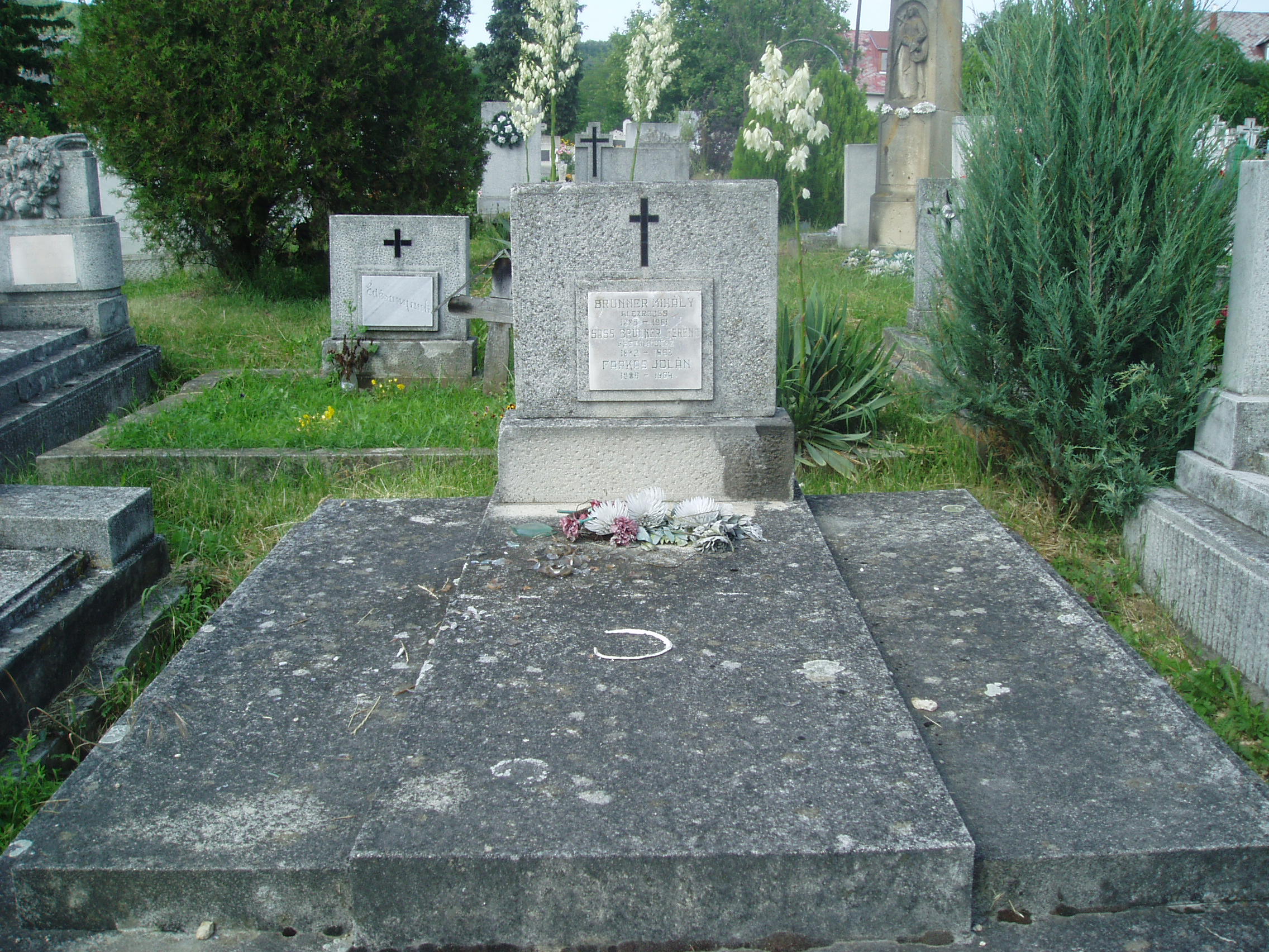 Nyilvános 1208 | 2510 | Sümeg, Temető. Sass Brunner Ferenc sírja | Sümeg délkeleti határában, a Tapolcára vezető út mellett emelkedő lankás domboldalon találjuk a város köztemetőjét. Helyét még Bíró Márton püspök jelölte ki; jelentősebb számban a XIX. század eleje óta kezdtek ide temetkezni. A temetődomb tetején áll az 1816-ban épített, későbarokk stílusú temetőkápolna. Körülötte a sümegi élet utolsó két évszázada szinte valamennyi híres személyiségének sírja fellelhető. A temetőkápolna és a modern ravatalozó között húzódó temetőrészben nyugszik Sass Brunner Ferenc (1882-1963) (eredeti nevén Brunner Ferenc) festőművész. Hollósy Simonnál és Ferenczy Károlynál tanulta a festészetet. A nagykanizsai Sass Erzsébetet vette feleségül, de nem sokáig éltek együtt. Felesége és leánya, Brunner Erzsébet 1929-ben Indiába mentek, ahol végleg le is telepedtek, s ott is haltak meg. Anya és lánya is jeles festőművész volt (lásd még: Sümeg, Kisfaludy tér 2.). Sass Brunner Ferenc liberális nézetei miatt többször megjárta a rendőrséget, zaklatásoknak volt kitéve. Zárkózottá vált, egyre kevesebbet festett, s az 1920-as évek végén Sümegre költözött. Itt katonatiszt testvére tartotta el (ő is ebben a sírban nyugszik), az 50-es évektől kegydíjat kapott. A fénykép 2007 júniusában készült. Felh. irod.: Koppány Tibor - Kozák Károly: Sümeg útikalauz. Veszprém, Idegenforgalmi Hivatal, 1965 Sümegi kalauz. Sümeg, Sümegi Fórum Alapítvány, 1993 Miklósi-Sikes Csaba: Kőbe vésett történelem. A sümegi városi temetők története és sírjelei 1950-ig. Sümeg, Sümegi Fórum Alapítvány, 2002 Veszprém megyei életrajzi lexikon. Veszprém, Veszprém Megyei Önkormányzat Közgyűlése, 1998 |