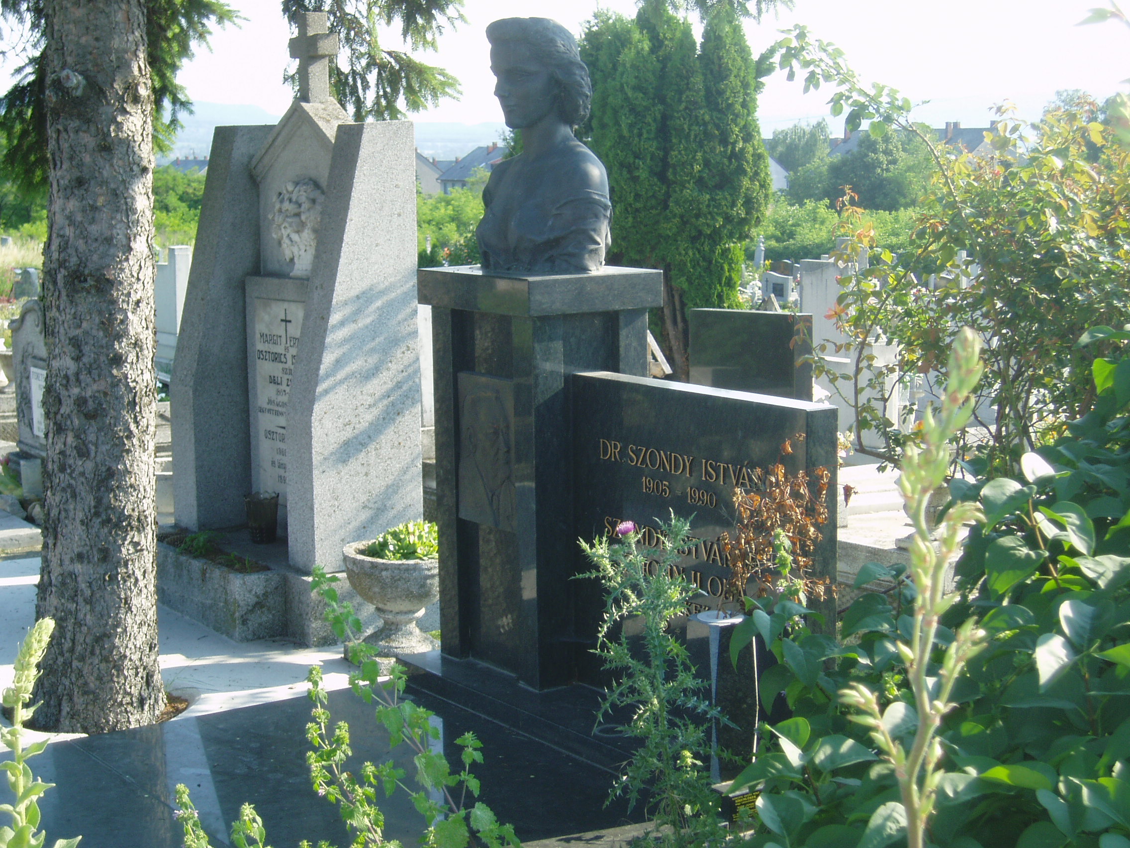 Nyilvános 1158 | 1983 | Sümeg, Temető. Szondy Istvánné "Lilike" sírja | Sümeg délkeleti határában, a Tapolcára vezető út mellett emelkedő lankás domboldalon találjuk a város köztemetőjét. Helyét még Bíró Márton püspök jelölte ki; jelentősebb számban a XIX. század eleje óta kezdtek ide temetkezni. A temetődomb tetején áll az 1816-ban épített, későbarokk stílusú temetőkápolna. Körülötte a sümegi élet utolsó két évszázada szinte valamennyi híres személyiségének sírja fellelhető. A Ferences rend sírkertjének nagy homokkő-keresztje közelében nyugszik Szondy István orvos és felesége, az 1987-ben elhunyt John Ilona, azaz Lilike. Lilike gazdag műgyűjteményt hozott létre, amelyet előbb saját házukban állítottak ki (lásd: Váralja u. 6.), majd az anyag a Kisfaludy Sándor Múzeumba került, ahol egy külön emlékszobában tekinthetők meg legértékesebb darabjai (lásd: Kisfaludy tér 2.). A fénykép 2007 júniusában készült. Felh. irod.: Koppány Tibor - Kozák Károly: Sümeg útikalauz. Veszprém, Idegenforgalmi Hivatal, 1965 Sümegi kalauz. Sümeg, Sümegi Fórum Alapítvány, 1993 Miklósi-Sikes Csaba: Kőbe vésett történelem. A sümegi városi temetők története és sírjelei 1950-ig. Sümeg, Sümegi Fórum Alapítvány, 2002 Veszprém megyei életrajzi lexikon. Veszprém, Veszprém Megyei Önkormányzat Közgyűlése, 1998 |
