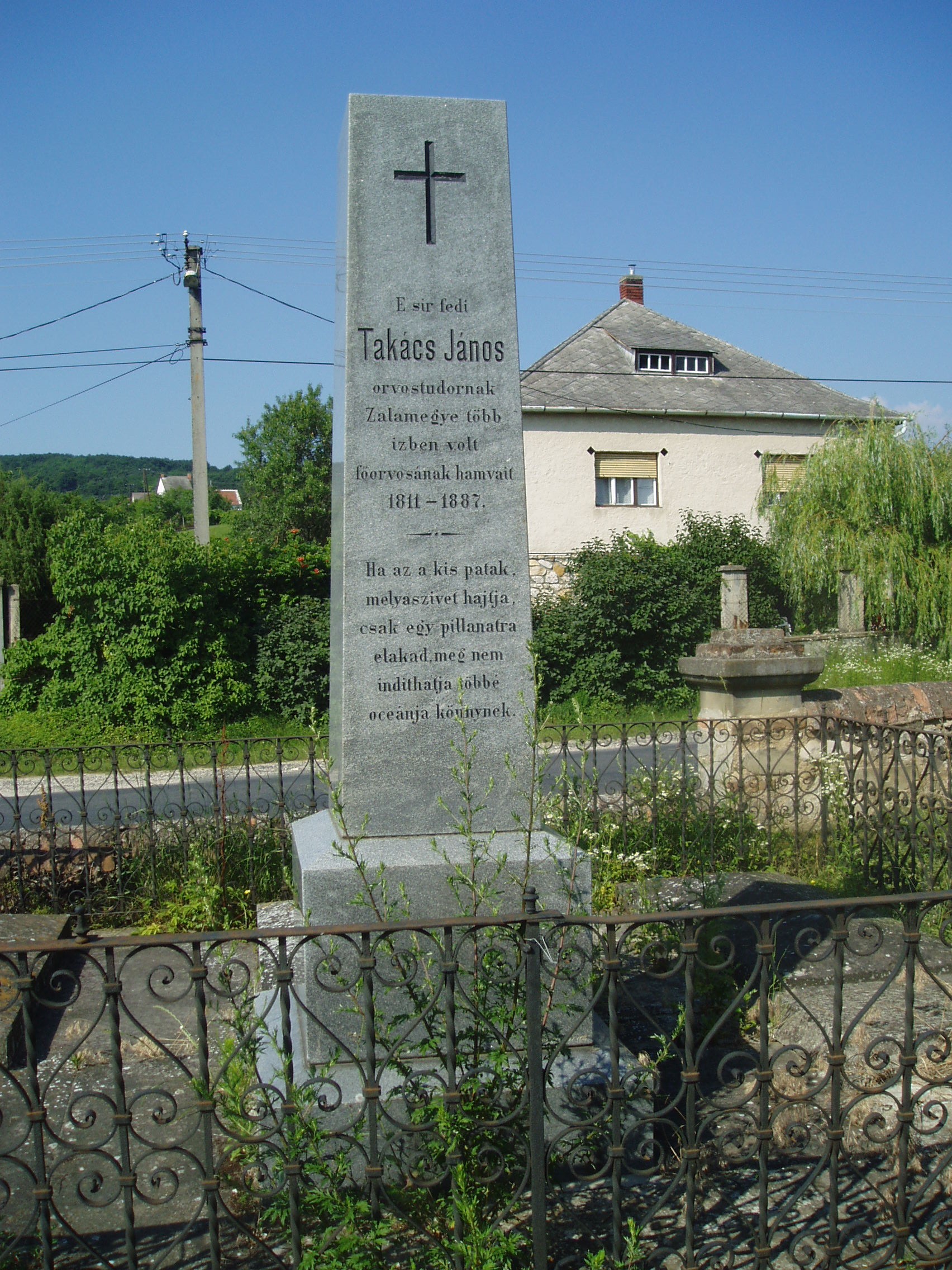 Nyilvános 1192 | 1925 | Sümeg, Temető. Takács János sírja | Sümeg délkeleti határában, a Tapolcára vezető út mellett emelkedő lankás domboldalon találjuk a város köztemetőjét. Helyét még Bíró Márton püspök jelölte ki; jelentősebb számban a XIX. század eleje óta kezdtek ide temetkezni. A temetődomb tetején áll az 1816-ban épített, későbarokk stílusú temetőkápolna. Körülötte a sümegi élet utolsó két évszázada szinte valamennyi híres személyiségének sírja fellelhető. Itt nyugszik Takács János (1811-1887) orvostudor, Zala megye egykori főorvosa. Sümegre az 1830-as években került, ahol háziorvosa lett az idősödő Kisfaludy Sándornak. A fénykép 2007 júniusában készült. Felh. irod.: Koppány Tibor - Kozák Károly: Sümeg útikalauz. Veszprém, Idegenforgalmi Hivatal, 1965 Sümegi kalauz. Sümeg, Sümegi Fórum Alapítvány, 1993 Miklósi-Sikes Csaba: Kőbe vésett történelem. A sümegi városi temetők története és sírjelei 1950-ig. Sümeg, Sümegi Fórum Alapítvány, 2002 Veszprém megyei életrajzi lexikon. Veszprém, Veszprém Megyei Önkormányzat Közgyűlése, 1998 |