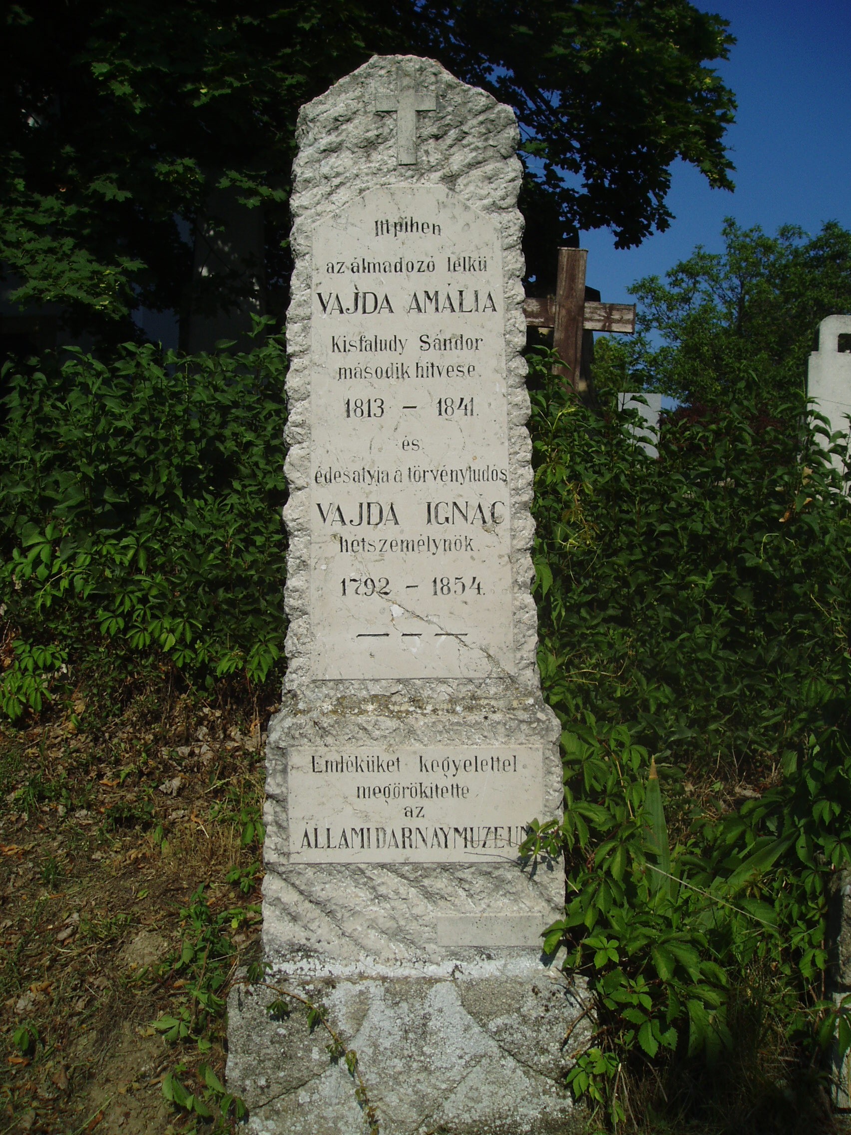 Nyilvános 1179 | 2963 | Sümeg, Temető. Vajda Ignác és Amália sírja | Sümeg délkeleti határában, a Tapolcára vezető út mellett emelkedő lankás domboldalon találjuk a város köztemetőjét. Helyét még Bíró Márton püspök jelölte ki; jelentősebb számban a XIX. század eleje óta kezdtek ide temetkezni. A temetődomb tetején áll az 1816-ban épített, későbarokk stílusú temetőkápolna. Körülötte a sümegi élet utolsó két évszázada szinte valamennyi híres személyiségének sírja fellelhető. A temetőkápolna közelében nyugszik Vajda Ignác (1792-1854) hétszemélynök, több jogi kézikönyv szerzője és fiatalon elhunyt leánya, Vajda Amália (1813-1841), Kisfaludy Sándor költő második felesége 1834-1841 között. A fénykép 2007 júniusában készült. Felh. irod.: Koppány Tibor - Kozák Károly: Sümeg útikalauz. Veszprém, Idegenforgalmi Hivatal, 1965 Sümegi kalauz. Sümeg, Sümegi Fórum Alapítvány, 1993 Miklósi-Sikes Csaba: Kőbe vésett történelem. A sümegi városi temetők története és sírjelei 1950-ig. Sümeg, Sümegi Fórum Alapítvány, 2002 Veszprém megyei életrajzi lexikon. Veszprém, Veszprém Megyei Önkormányzat Közgyűlése, 1998 |