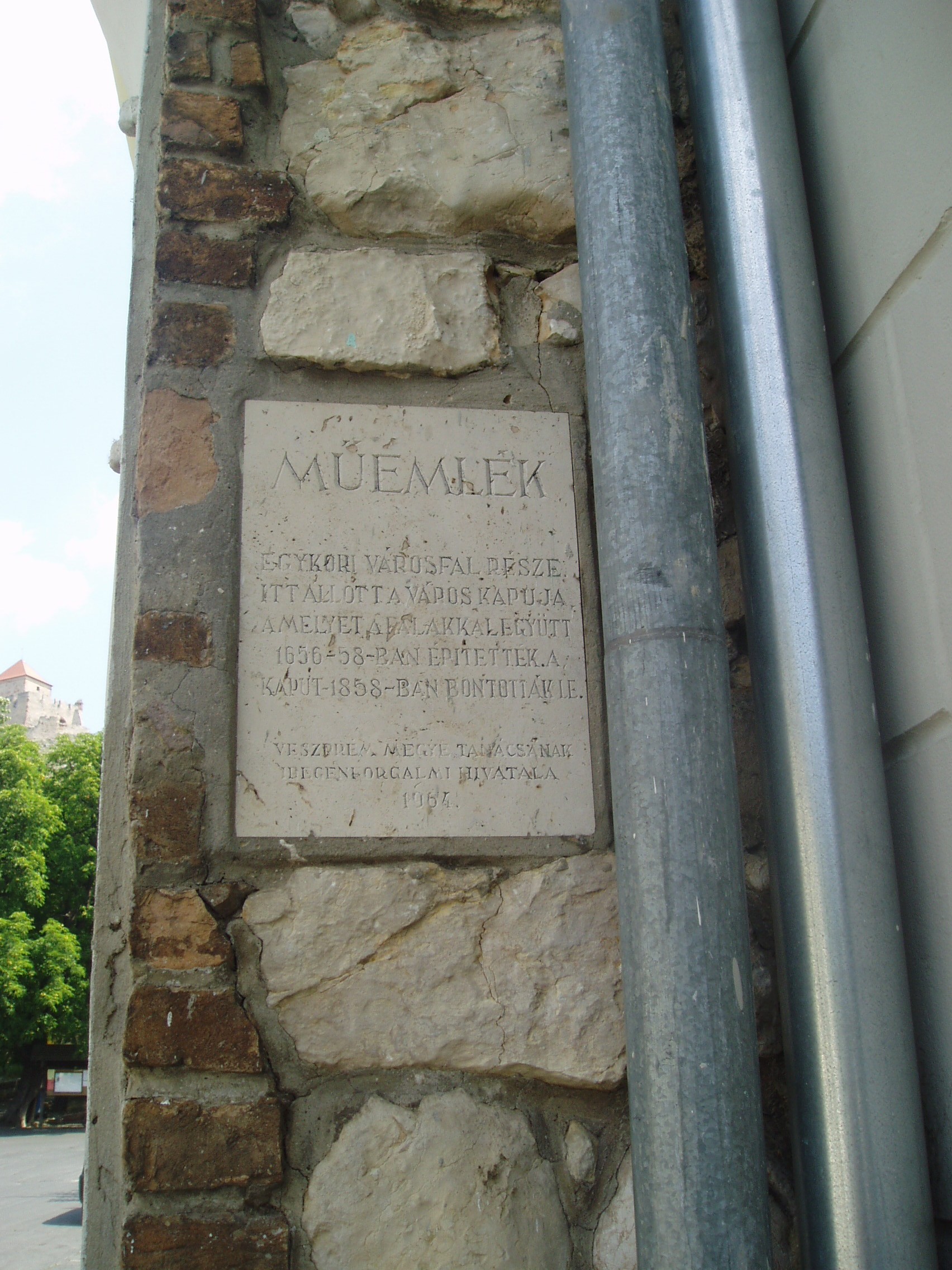 Nyilvános 1159 | 1724 | Sümeg, Kisfaludy tér - Kossuth u. sarok | 1656 és 1658 között Széchenyi György püspök kőfalakkal kerítette be Sümeg városát. Az egykor 1100 méter hosszú, bástyákkal megerősített és kapukkal ellátott kőfalak maradványaival több helyen is lehet találkozni a város területén (lásd még: Sümeg, Kossuth u. 31). A képen az egyik, 1916-ban lebontott városkapu emléktáblája látható. A fénykép 2007 júniusában készült. Felh. irod.: Koppány Tibor - Kozák Károly: Sümeg útikalauz. Veszprém, Idegenforgalmi Hivatal, 1965 Látnivalók Veszprém megyében. Miskolc, Well-PRess, 2004 Sümegi kalauz. Sümeg, Sümegi Fórum alapítvány, 1993 |
