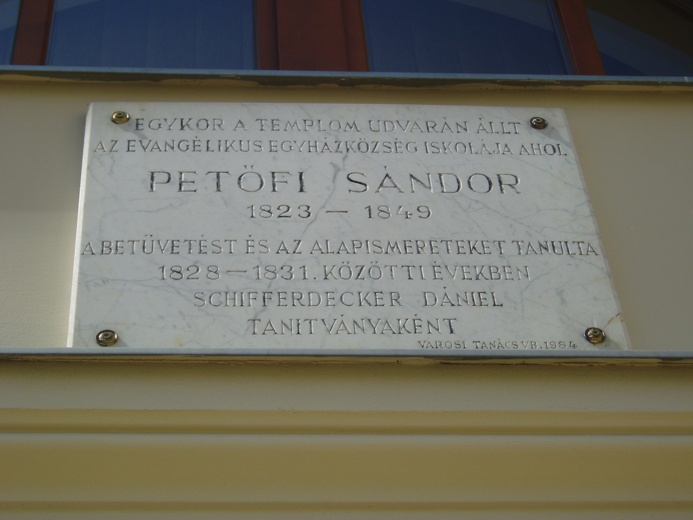 Nyilvános 1376 | 2514 | Kecskemét, Arany János utca 1. | Az Ybl Miklós által tervezett evangélikus templom mellett áll az Evangélikus Egyház Lelkészi Hivatalának épülete. Rajta márványtábla idézi Petőfi Sándor emlékét, aki itt, az egykor ezen a helyen állott elemi iskolában tanult kisiskolás korában. Egy másik, ugyanerre vonatkozó emléktáblát a közelben álló Szabadság tér 3. számú épületen is elhelyeztek. A fénykép 2006 augusztusában készült. Felh. irod.: Heltai Nándor: Kecskemét. Kecskeméti Lapok, 1998 |