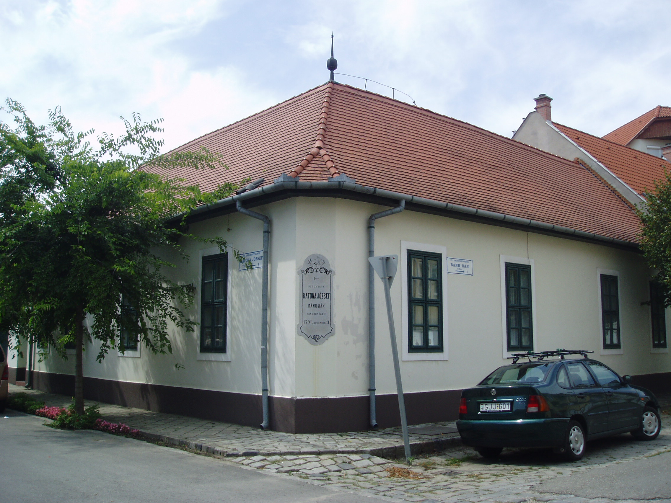 Nyilvános 1215 | 2017 | Kecskemét, Katona József utca 5. Katona József szülőháza | Egyes útikönyvek szerint a ház csak cseréptetős mása Katona József egykor itt állott szülőházának, más források szerint viszont a falai eredetiek, csak jócskán felújítottak. A ház Katona Tamás takácsmesteré, a drámaíró nagyapjáé volt, azóta élt benne a család. Katona József apja is takácsmester volt. Miután Katona József pesti tanulmányai és színházi működése után hazatért a városba, városi ügyész lett és itt, a szülői házban élt. Itt történt, hogy Katona Józsefet meglátogatta egy régi színész ismerőse, Udvarhelyi Miklós, aki 1860-ban így emlékezett vissza találkozására Katona Józseffel: "Színészek közül én voltam az első, kinek Bánk bánját egy délutáni órában atyjának szövőszékére ülve mindketten, egy kancsó bor mellett felolvasta." Udvarhelyi Miklós lett az, akinek köszönhetően került sor 1830-ban, már Katona József halála után a Bánk bán kassai ősbemutatójára, ugyanis jutalomjátékára Udvarhelyi a Bánk bán egy szerény szerepét, Mikhál bánt választotta. Katona József a kecskeméti városháza régi épületében hunyt el szívszélhűdés következtében (lásd: Kecskemét, Kossuth tér). Egykori lakóházában ma emlékmúzeuma tekinthető meg számos eredeti relikviával. Emléktábláját 1883-ban avatták fel. A fénykép 2006 augusztusában készült. Felh. irod.: Heltai Nándor: Kecskemét. Kecskeméti Lapok, 1998 Katona emlékkönyv. Kecskemét, Katona József Kör, 1930 |