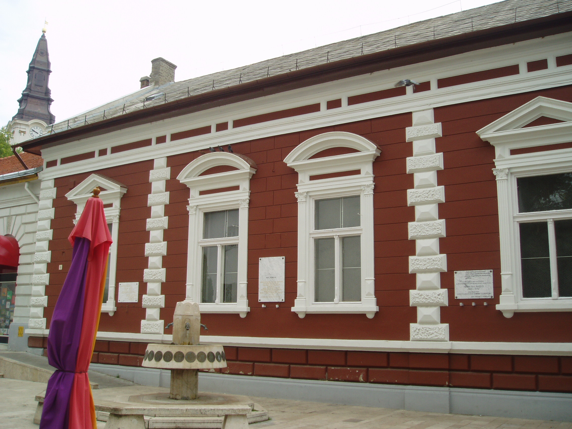 Nyilvános 1166 | 1685 | Kecskemét, Kéttemplomköz 6. | A református Ókollégium (lásd: Kecskemét, Kálvin tér 1.) Kéttemplomközre néző tornatermének falán helyezték el Németh László író, a "Kert-Magyarország eszme apostolának" emléktábláját. Ugyanitt egy másik márványtábla Ádám Jenőre, Kodály Zoltán egyik legközelebbi munkatársára emlékeztet. A fénykép 2006 augusztusában készült. |