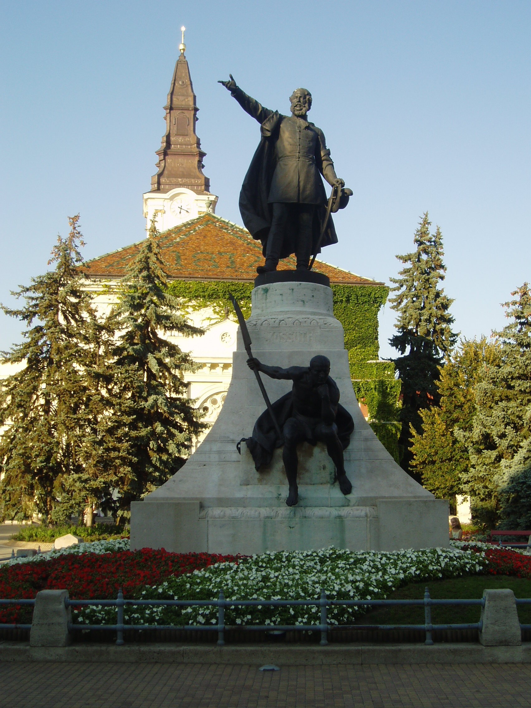 Nyilvános 1218 | 2062 | Kecskemét, Kossuth tér: Kossuth Lajos szobra | Kossuth Lajos 2 és fél méter magas bronzszobrát, Telcs Ede alkotását 1906-ban avatták fel Kecskemét központjában. Az alkotás az 1848/49-es forradalom és szabadságharc emléke mellett Kossuth 1848. szeptember 25-én — ugyanezen a helyen, az akkori régi vásártéren — elmondott toborzó beszédét is felidézi. A szobor ülő mellékalakja kiegyenesített kaszát tart a kezében. E mellékalakról maga a szobrász mondta, hogy ugyan Rodin: Gondolkodó című híres szobrához nagyon hasonló pózban ül, de megfeszített izmokkal, készen rá, hogy ha Kossuth „mégegyszer azt üzeni”, a kezében tartott kiegyenesített kaszával rögtön rámenjen az osztrákra. A helyi hagyomány szerint e mellékalak modellje Kacsóh Pongrác, a János vitéz alapján írt daljáték zeneszerzője volt. A fénykép 2006 augusztusában készült. Felh. irod.: Heltai Nándor: Kecskemét. Kecskeméti Lapok, 1998 Orosz Andrea: Kiskunság és Felső-Bácska. Bp. Frigoria, 2004 |