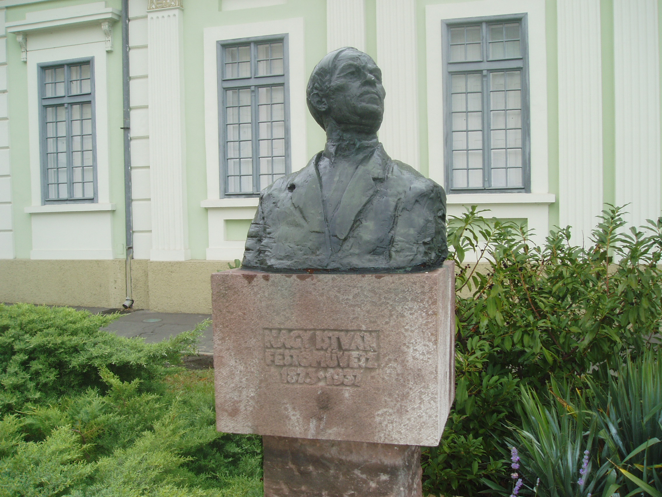 Nyilvános 1565 | 3242 | Baja, Arany János utca 1. | Az egykori Vojnich-kúria 1820 körül épült klasszicista stílusban. 1946 és 1953 között ez az épület adott otthont a Rudnay Gyulának és az általa vezetett művésztelepnek. A kúria ma a Nagy István Baján élt (lásd: Baja, Nagy István u. 8.) festőről elnevezett képtár otthona. Az épület előtti teret Nagy István bronz mellszobra, Varga Imre alkotása díszíti. A fénykép 2007 októberében készült. Felh. irod.: Látnivalók Bács-Kiskun megyében. Miskolc, Well-PRess, 2002 |