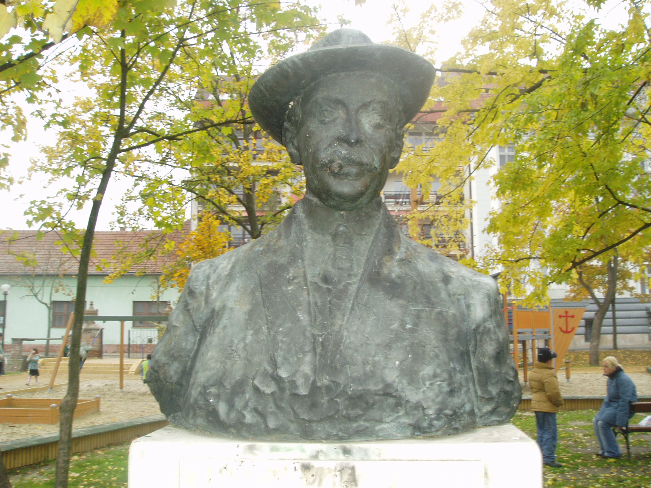 Nyilvános 1161 | 2220 | Baja, Déri kert | A belváros romantikus parkja Déri Frigyes, a bajai származású, szülővárosába dúsgazdagon hazatérő selyemgyáros, műgyűjtő nevét viseli, hiszen a szép sétakert az ő kezdeményezésére jött létre. Déri Frigyes röviddel az első világháború kitörése előtt gyermekkora városának ajánlotta fel gazdag egyetemes kultúrtörténeti gyűjteményét és könyvtárát. Fel akarta építeni a közművelődés házát, ezért vásárolta meg a ferences barátok kertjének egy részét, s azt a városnak ajándékozta. Az első világháború kitörése miatt azonban tervének megvalósítását a "béke helyreállta utáni" időkre halasztották. A háború után 1919-ben azonban Baja szerb megszállás alá került, s Déri - bizonytalannak ítélve a város sordát - visszavonta adományát, s gyűjteményét Debrecennek ajándékozta (lásd: Hajdú-Bihar megye/Debrecen, Déri tér 1.). Az általa megvásárolt területen pihenőparkot hoztak létre. Bejáratánál emléktábla örökíti meg Déri Frigyes nevét, akinek a parkban mellszobrát is felállították (lásd az előző képen). (Az ezen a képen látható szobor is valószínűleg Déri Frigyest ábrázolja, de sajnos semmilyen forrásban nem bukkantam adatra, mint ahogy az előző szobor alkotójáról sem - K.K.) A fénykép 2007 októberében készült. Felh. irod.: Látnivalók Bács-Kiskun megyében. Miskolc, Well-PRess, 2002 www.museum.hu/museum/index_hu.php?ID=108 |