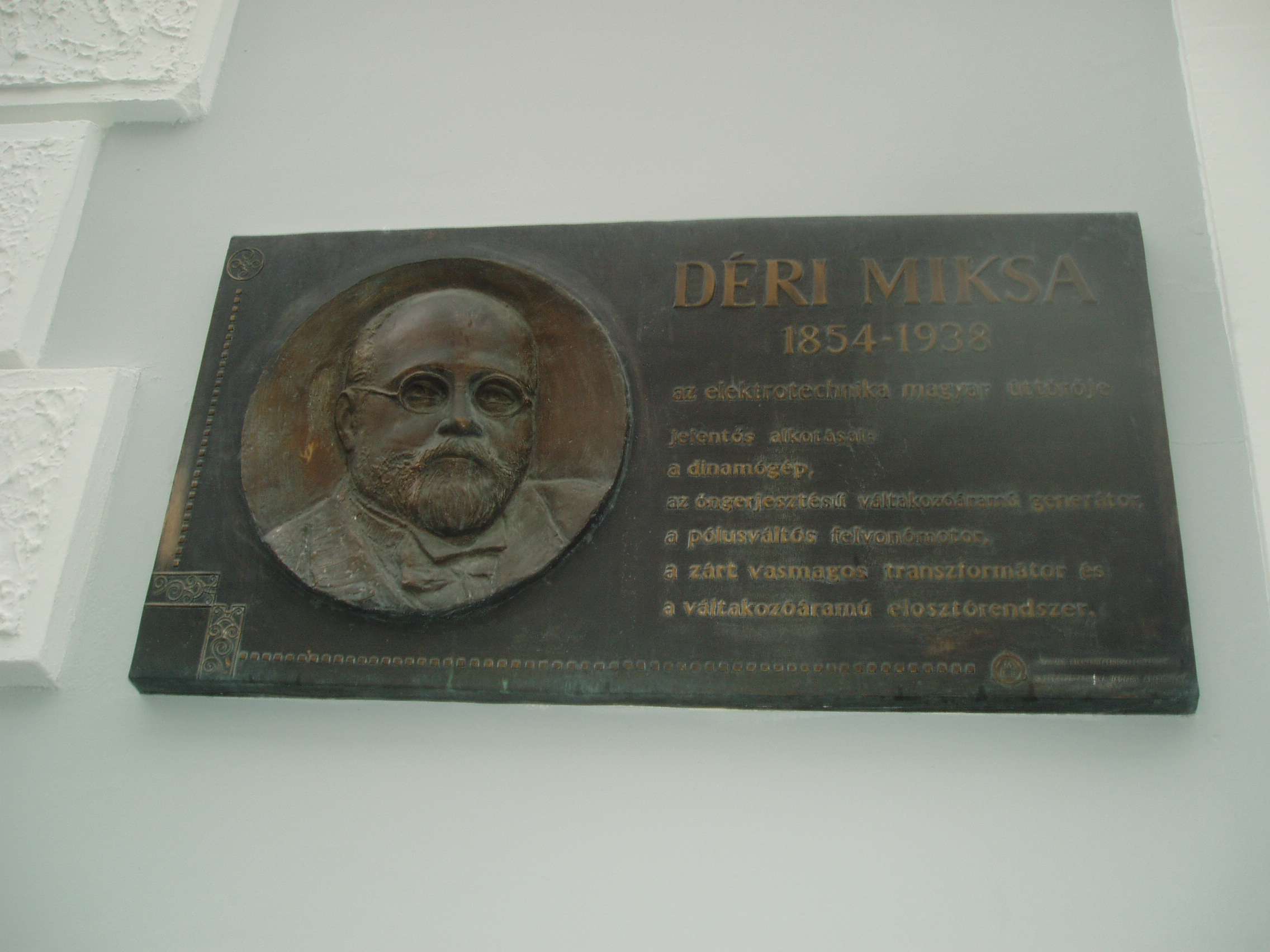Nyilvános 1240 | 2048 | Baja, Déri Miksa köz: Déri Miksa emléktáblája | A róla elnevezett kis belvárosi közre néző épület falán elhelyezték a névadó emléktábláját. Déri Miksa (1854-1938) a korszerű elektrotechnika elméleti és gyakorlati megalapozója, a transzformátor egyik felfedezője volt. Az egykori Bács-Bodrog megye déli részén fekvő Bács községben született gazdag kereskedőcsalád sarjaként. Testvére volt Déri Frigyes (lásd: Baja, Déri kert) és Déri Kálmán festőművész. A bajai cisztercita gimnáziumba (lásd: Baja, Szent Imre tér 5.) járt, műszaki tanulmányait a budapesti József Műegyetem mérnöki szakosztályán kezdte el, vízépítő-mérnöki oklevelet 1877-ben szerzett a Bécsi Műegyetemen. Először folyamszabályozási munkákban vett részt a fővárosban és Szegeden, de már ekkor foglalkoztatta a villamosság. Zipernowsky Károly - akivel még az első elektrotechnikai próbálkozások idején ismeretséget kötött - 1882-ben munkatársul fogadta és Déri belépett a Ganz gyár Elektromos Osztályára. Közös munkájuk első eredménye az öngerjesztésű váltakozó áramú generátor volt. Déri 1883-tól kezdve Bécsben dolgozott a gyár ausztriai képviselőjeként, de a kutatói munkát Zipernowskyval továbbra is rendszeresen folytatták. Kiváló munkatársat kaptak Bláthy Ottó személyében, aki szintén a Ganznál dolgozott gépszerkesztőként. Nagyrészt a három feltalálónak köszönhetően a Ganz gyár néhány éven belül tekintélyes, nemzetközi jelentőségű vállalattá fejlődött. Bláthy ötletére 1885-ben megalkották a zárt vasmagú transzformátort, amelynek megalkotásában Déri a kísérleti munka oroszlánrészét végezte. Szabadalmukat Zipernowsky-Déri-Bláthy (ZBD) transzformátor néven ismerte meg a világ. 1889-től Déri az akkor alapított bécsi Internationale Électricitäts Gesellschaft vezető igazgatója lett, még ebben az évben megszervezte és berendezte a bécsi villamos-erőművet. Bécs város villamos világításának koncesszióját a bécsi Union Bank és a Ganz-gyár nyerték el, e két vállalat alapította az I.E.G. vállalatot, amelynek Déri 1896-ig volt igazgatója. A vállalat az első olyan vállalkozás volt Európában, amely kizárólag villamos erőművek létesítésének pénzügyi szolgáltatása céljából alakult meg. Néhány év alatt 60 Monarchia-beli transzformátor telep kiépítésében vett részt. Déri Miksa számos egyéni, valamint Zipernowskyval és Bláthyval közösen kifejlesztett találmányt is magáénak mondhat. 1898 és 1902 között kidolgozta kompenzált egyenáramú gépét, majd 1903-1904-ben kifejlesztette a kétkefe-rendszerű egyfázisú repulziós motorát, amelyet a világirodalom Déri-motor néven ismer. 1938. március 5-én hunyt el 84 éves korában Merano-ban, ahol nyugalomba vonulva élt. A fénykép 2007 októberében készült. Felh. irod.: www.industrianet.hu/UserFiles/ehsz/Deri_Miksa.htm |
