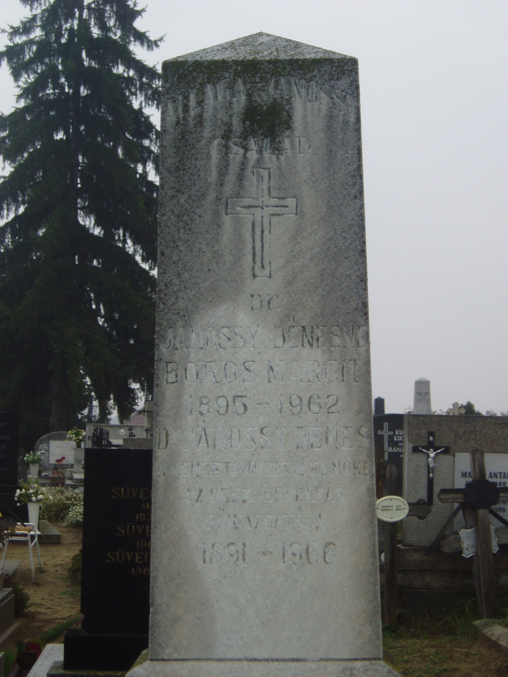 Nyilvános 1200 | 1956 | Baja, Rókus utca: Rókus temető - Jánossy Dénes sírja | A temetőkápolna közelében, Allaga Géza zeneszerzővel közös sírban nyugszik a rokonsághoz tartozó Jánossy Dénes (1891-1966) levéltáros, az MTA levelező tagja. Elsősorban a XIX. század politikai történetével, különösen a Kossuth-emigrációval foglalkozott. A fénykép 2007 októberében készült. Felh. irod.: Magyar életrajzi lexikon |