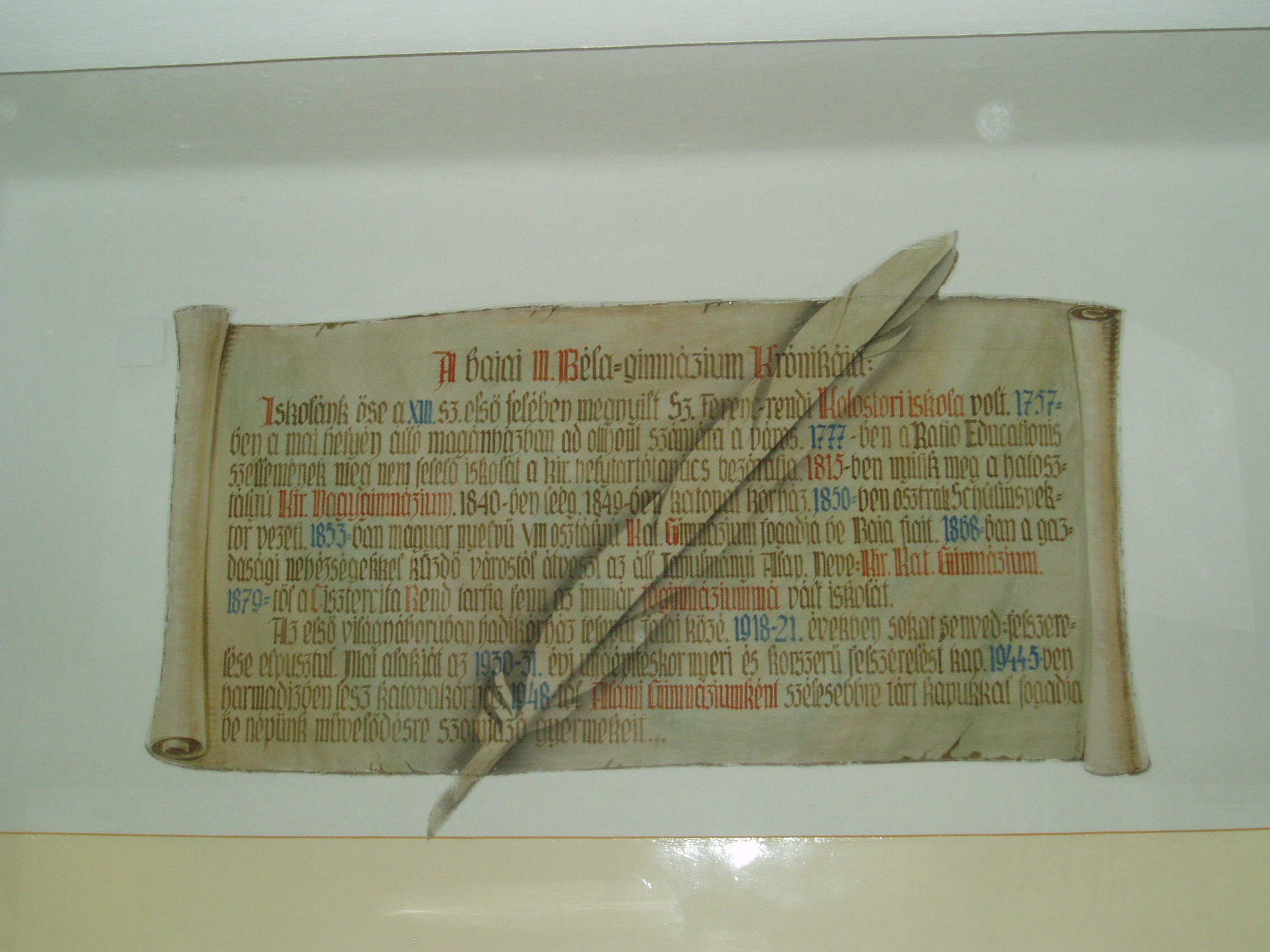 Nyilvános 1139 | 1550 | Baja, Szent Imre tér 5. III. Béla Gimnázium | A gimnázium krónikájának összefoglalása az előcsarnok falán. Az 1757-ben alapított iskola mai épületét 1815-ben emelték, majd 1892-ben és 1931-ben jelentősen bővítették, alakították. Korábban a közelben ma is álló ferences kolostorban (lásd: Baja, Bartók B. u. 1-3.) folyt a tanítás. Az intézmény a ferencesek után 1879-től a ciszterci rendé lett. III. Béla nevét, aki a ciszter rendet letelepítette Magyarországon, az 1921/22-es tanévben vette fel. Ma már szobra is ott áll az épület előtt. 1948 óta állami iskola. Híres növendéke volt Nagy Ignác író (1819–1821), Türr István (1835–1840), Tóth Kálmán költő (1839–1845), Szarvas Gábor nyelvész (1842–1848). Pályakezdőként az 1905/06-os tanévben itt tanított Babits Mihály. Az iskolának a zenei életben nevet szerzett diákjai is voltak. Ide járt gimnáziumba az 1902/03-as tanévtől nyolc éven át a bajai születésű Kun Imre (1892–1977), a legendás hangversenyrendező és az 1940-es évek elején a szintén Baján született Lukin László (1926–2004) zenepedagógus, karnagy. A fénykép 2007 októberében készült. Felh. irod.: Bálint László: A bajai III. Béla Gimnázium. Bp. Tankönyvkiadó, 1989 |