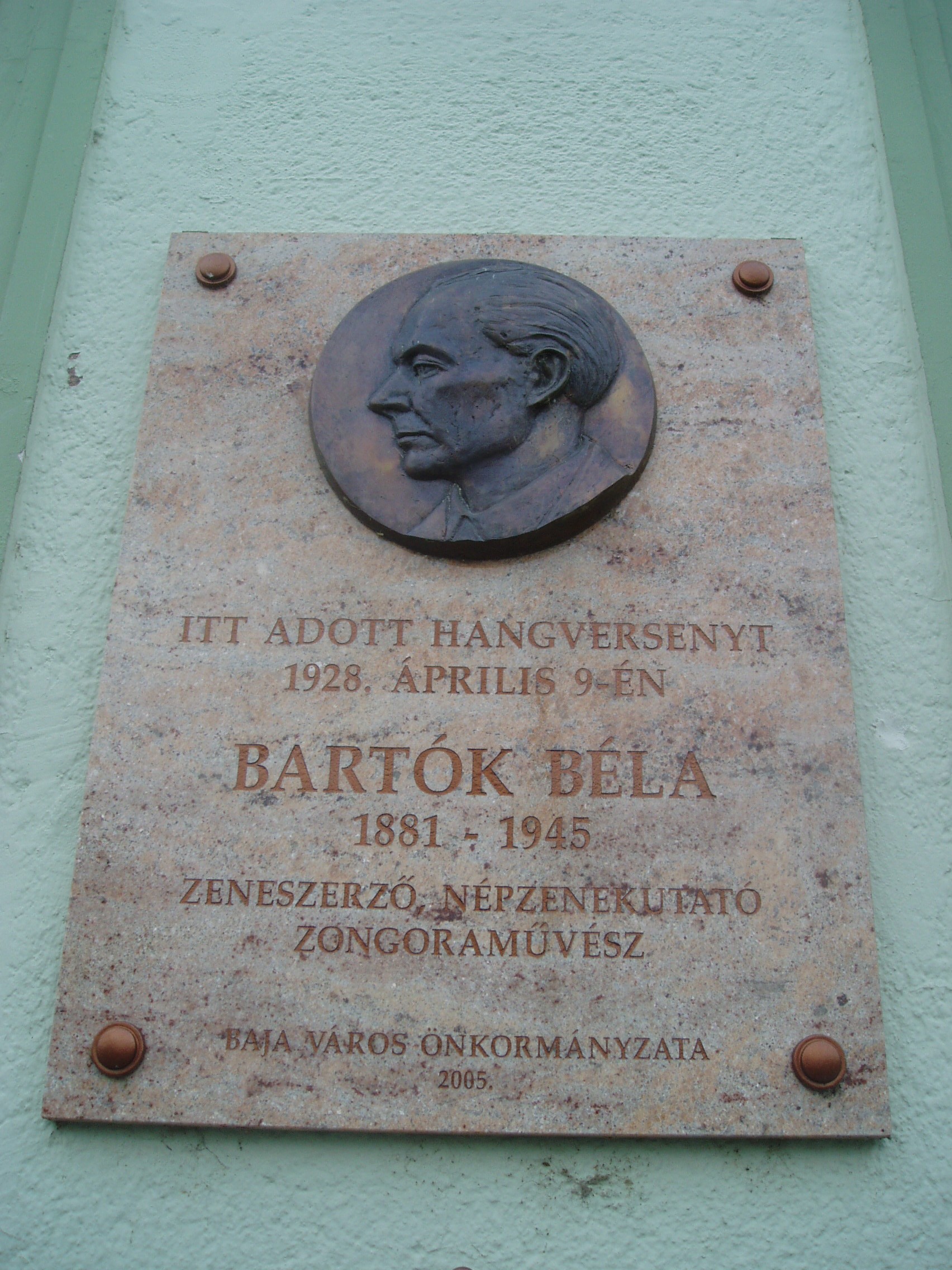 Nyilvános 1208 | 1787 | Baja, Szentháromság tér 6. Duna Hotel | A magyar Szent Márk térnek is nevezett Szentháromság tér Sugovica felőli oldalán áll az 1860-as években épített szálloda. Alapításakor Nemzeti Szállónak hívták. Kezdettől fogva Baja nevezetessége, a „boldog békeidők” gazdag Bácskájának találkozóhelye volt, messze idegenből is érkeztek vendégei. Az 1950-ben államosított, és akkoriban Béke szállónak nevezett épülethez abban az időben építészetileg oda nem illő részeket is toldottak, megváltoztatva az épülettest külső tagolását is, leegyszerűsítve épületplasztikáját. Duna szállodának 1960-ban nevezték el. A főépülethez derékszögben csatlakozó, eredetileg földszintes épületszárnyban volt a szálloda díszterme, ahol mulatságokat, színházi előadásokat, műsorokat és hangversenyeket tartottak. Az azóta sajnos lebontott nagyteremben (helyén ma különterem és konyha van) a bajai Liszt Ferenc Kör meghívására fellépett többek között Basilides Mária, Dohnányi Ernő és Hubay Jenő. Amint a homlokzaton elhelyezett emléktáblán is olvasható, 1928. április 9-én, Húsvét hétfőn Bartók Béla adott a teremben szólóestet. A fénykép 2007 októberében készült. Felh. irod.: Látnivalók Bács-Kiskun megyében. Miskolc, Well-PRess, 2002 www.hotelduna.hu Gál Zoltán: Bartók bajai hangversenye. = www.bacskaisport.hu |