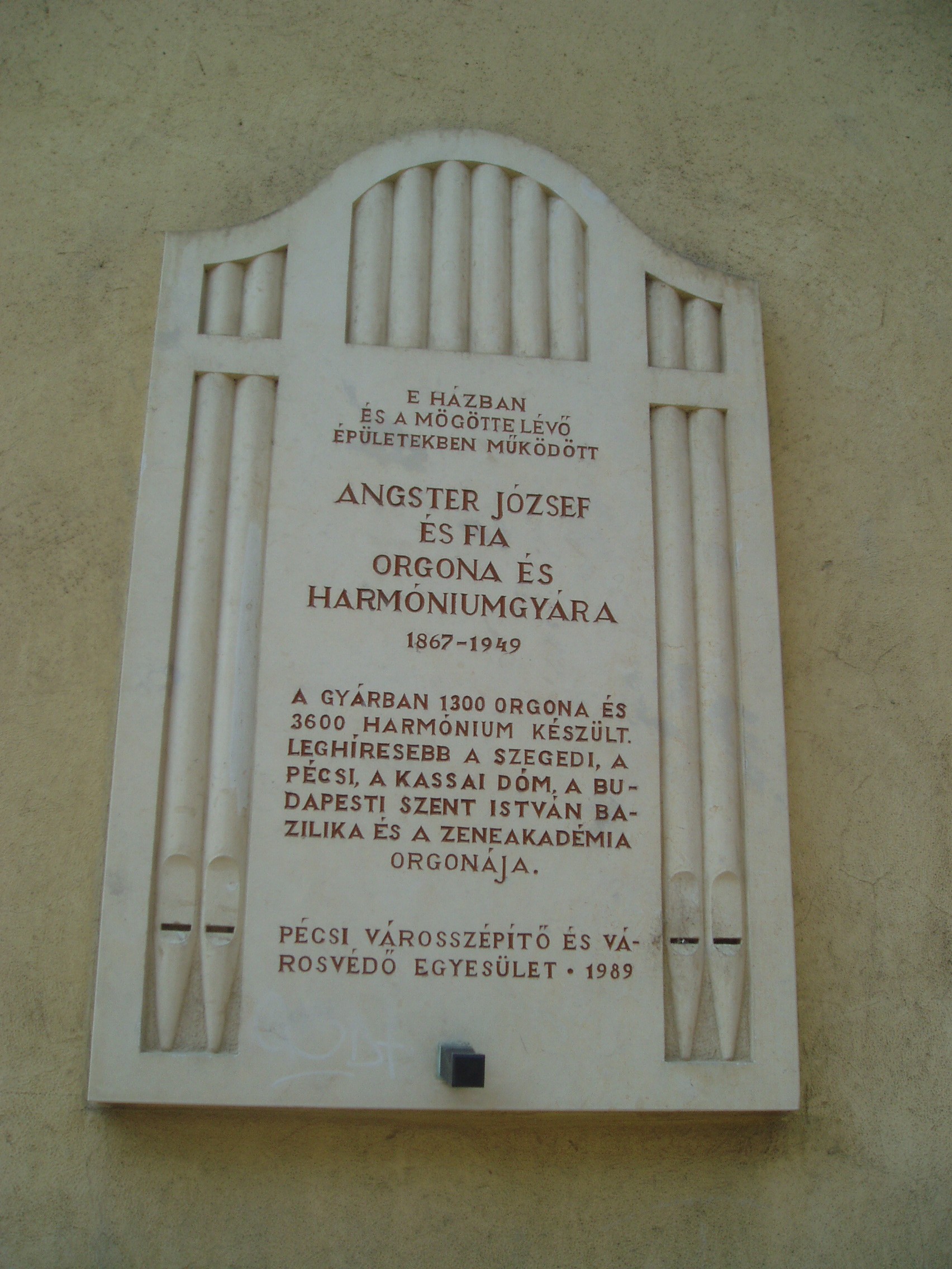 Nyilvános 1175 | 1835 | Pécs, Mária utca 35. | Fénykorában itt, és a környező épületekben működött az Angster orgonagyár. Alapítója, Angster József (1834–1918) nem született bele a szakmába. Eszéki asztalos–tanoncként töltött évek után Bécsben tanulta a hangszerkészítő szakmát. Tudását Párizsban tökéletesítette a világhírű Cavaillé–Coll orgonagyárban, ahonnét az akkor elérhető legmagasabb képzettséggel érkezett haza. Saját gyárának megalapítása után az első kimagasló szakmai sikert a kalocsai székesegyház (lásd: Kalocsa, Szentháromság tér) számára megépített orgonája hozta meg számára. Az orgonaüzem többször költözött, mert a megrendelések szaporodása miatt egyre nagyobb helyre lett szüksége. A József utcába való költözés jelentette a végleges telephely kialakításának első lépését. A gyártelepet 1891-ben tovább bővítették a József utcával párhuzamos Mária utcában levő 35. számú épülettel; ezen a házon látható az 1989-ben felavatott emléktábla. A századfordulón a kitűnő Angster–orgonák már szinte benépesítették a Kárpát–medencét, sőt eljutottak az akkori határokon túlra is. A fejlődés kiemelkedő lépcsőfoka volt a pécsi Belvárosi plébániatemplom (lásd: Pécs, Széchenyi tér) orgonájának ünnepélyes felavatása 1886-ban. Közben Angster József fiai, Emil és Oszkár is bekapcsolódtak a munkába, és apjuk 1918-ban ebben a házban bekövetkezett halála után ők vezették a céget. olyan hangszerek születtek, mint a budapesti Zeneakadémia orgonája 1925-ben és a szegedi Fogadalmi templom hatalmas hangszere. 1940-ben a harmadik Angster–generáció vette át a vezetést: Angster József és Imre. Az ő háborús idejükben is megtartotta hírét az üzem, de 1949. december 28-án bekövetkezett az államosítás, a fokozatos megszüntetés, a vezetők meghurcolása és a berendezések kiselejtezése. Napjainkban az Angster–hagyomány a tudomány síkján a stuttgarti Fraunhofer tudományos intézetben Angster Judit és férje, Miklós András révén, a gyakorlatban pedig az 1992 óta működő Pécsi Orgonaépítő Manufaktúra (Pécs, Buzsáki utca 37.) munkájában folytatódik. A fénykép 2006 júliusában készült. Felh. irod.: Angster József: Az Angster-család és az Angster Orgonagyár történetéből. = Angstertől Zsolnayig. Ipartörténeti tanulmányok. Pécs, 1999 |