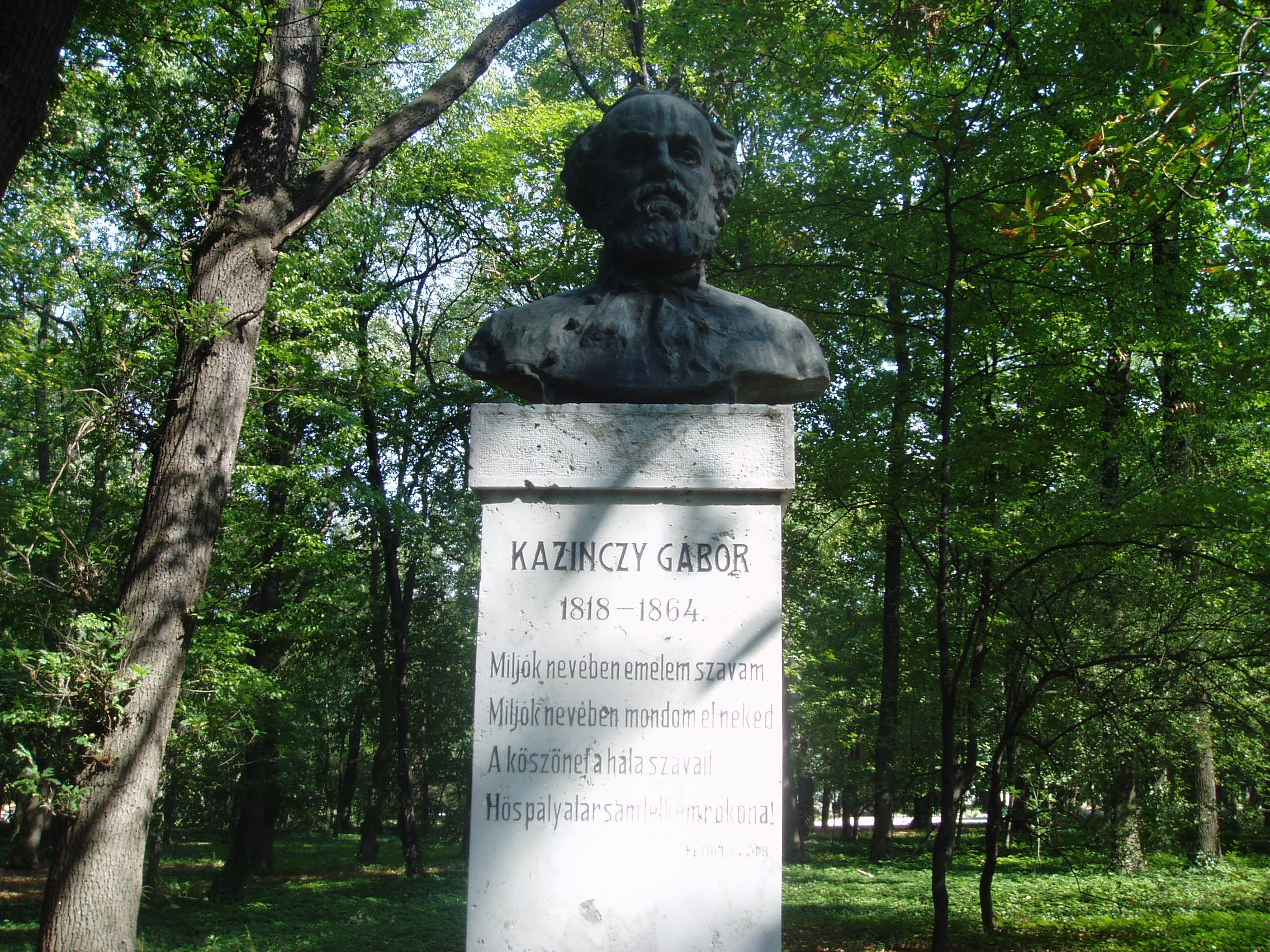 Nyilvános 1185 | 1892 | Sárospatak, Iskolakert: Kazinczy Gábor szobra | A Református Kollégium (lásd: Sárospatak, Rákóczi u. 1.) bejáratával szemben találjuk az Iskolakertnek nevezett parkot. Az 1980-as években természetvédelmi területté nyilvánított Iskolakert sajátos nemzeti érték, mely egyedülálló az országban. Sétányai mentén Patakhoz kötődő jeles személyiségek szobrai állnak. Kazinczy Gábor (1818-1864) bronz mellszobrát, Maugsch Gyula alkotását 1937-ben avatták fel a Kossuth Kollégiumhoz vezető út jobb oldalán. Nagybátyja, Kazinczy Ferenc példáján felbuzdulva már tizenhárom éves korában elhatározta, hogy író lesz. Népbarát című lapja köré egész írókör tömörült. Későbbi életében már a politika játszotta a vezető szerepet: a reformellenzék egyik legnépszerűbb alakja volt. Szónoki tehetsége, melyet Petőfi is magasztalt, kortársai véleménye szerint Kossuthéval vetekedett. A szabadságharc bukása után hazája sorsa felett kétségbeesve a Borsod megyei Bánfalván húzódott meg, és csak 1861-ben lépett újra a nyilvánosság elé élete egyik legnagyobb hatású országgyűlési beszédével, majd reményeiben csalatkozva újra és most már véglegesen eltemetkezett magányába. A fénykép 2007 augusztusában készült. Felh. irod.: Látnivalók Borsod-Abaúj-Zemplén megyében. Miskolc, Well-PRess, 1995 www.sarospatak.hu/nevezetessegek A magyar irodalom története 3. kötet. Szerk. Sőtér István. Bp. Akadémiai Kiadó, 1965 |
