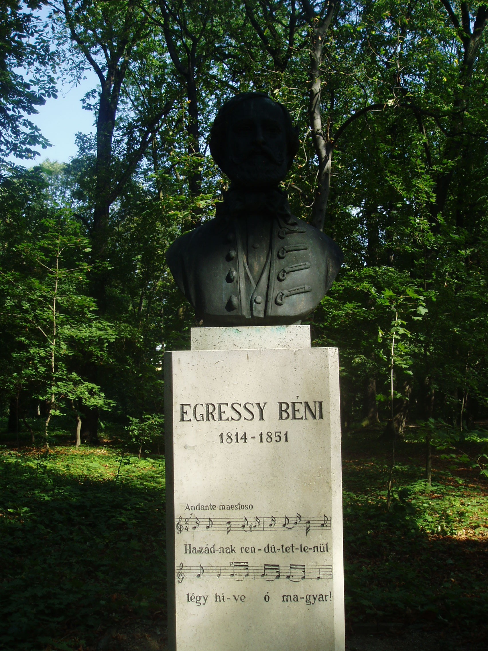 Nyilvános 1557 | 3805 | Sárospatak, Iskolakert: Egressy Béni szobra | A Református Kollégium (lásd: Sárospatak, Rákóczi u. 1.) bejáratával szemben találjuk az Iskolakertnek nevezett parkot. Az 1980-as években természetvédelmi területté nyilvánított Iskolakert sajátos nemzeti érték, mely egyedülálló az országban. Sétányai mentén Patakhoz kötődő jeles személyiségek szobrai állnak. A képen Egressy Béni bronz mellszobra látható. Kelemen Kristóf alkotását 1989-ben, a Szózat zeneszerzője születésének 175. évfordulója alkalmából avatták fel. Talapzatán hangjegyekkel és szöveggel a Szózat első két sora látható. Egressy Béni 1828–1831 között volt a kollégium diákja. Szobrának felállítását Béres Ferenc (1922–1996) énekművész kezdeményezte; ma már az ő szobra is az Iskolakertben áll, ugyanezen az oldalon. A fénykép 2007 augusztusában készült. Felh. irod.: Látnivalók Borsod-Abaúj-Zemplén megyében. Miskolc, Well-PRess, 1995 www.sarospatak.hu/nevezetessegek |