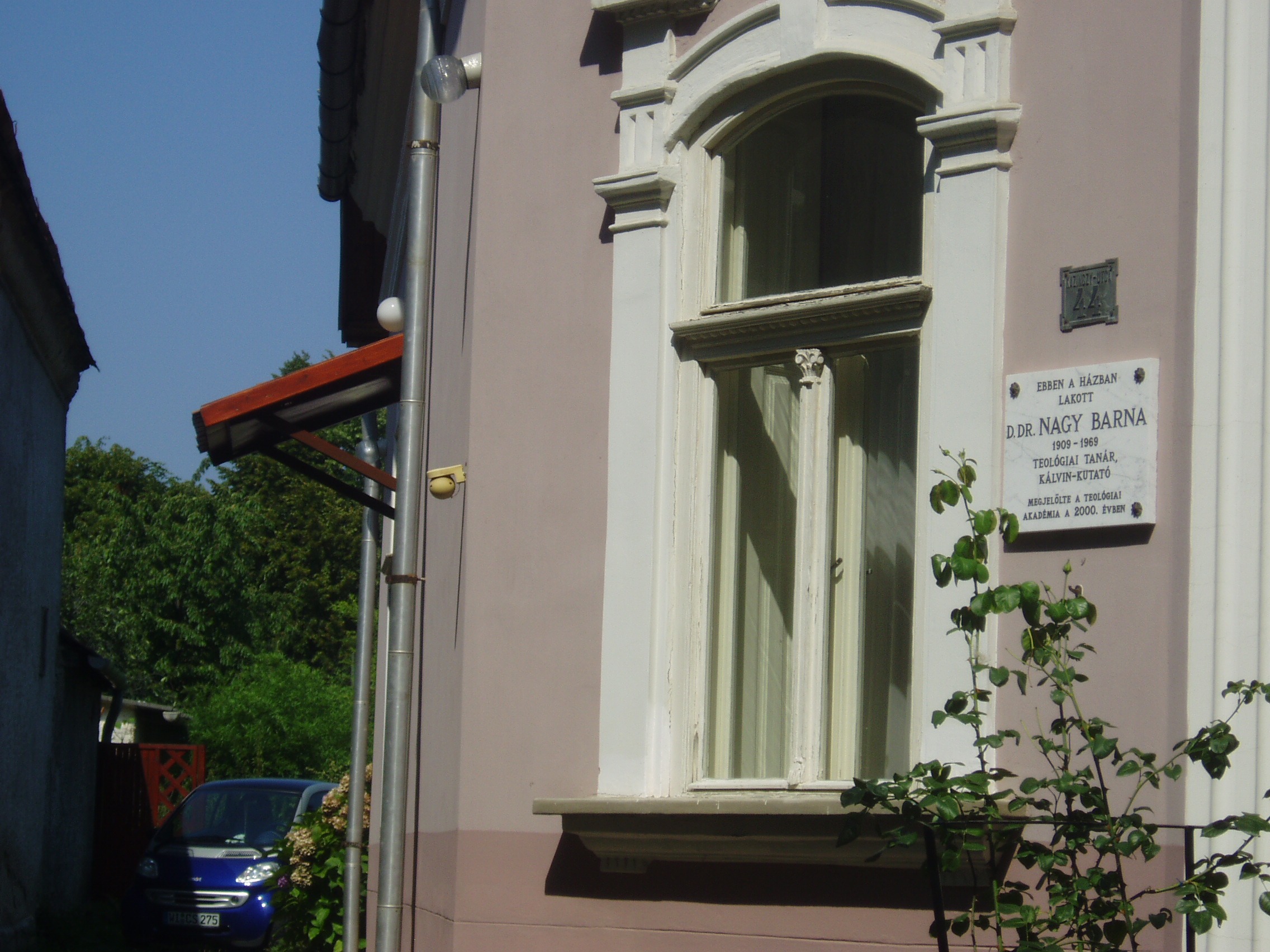Nyilvános 1161 | 1808 | Sárospatak, Kazinczy utca 44. | Ebben a házban lakott a sárospataki születésű Dr. D. Nagy Barna (1909-1969) teológiai tanár. református teológus, egyháztörténeti író, történész. Külföldi egyetemeken (Montpellier, Zürich, Bonn) végzett tanulmányai, majd néhány év segédlelkészi szolgálat után 1937-ben lett a sárospataki református teológiai főiskola tanára, melynek 1945 után igazgatója, majd rektora volt. A főiskola megszűntével a budapesti Református Teológiai Akadémia rendszeres teológiai tanszékének élére került. Dogmatörténettel, a magyar és közép-európai korai reformáció kérdéseivel foglalkozott. Mai francia nyelvre ültette át és sajtó alá rendezte Kálvin kiadatlan prédikációit; tanulmányokat közölt a Heidelbergi Kátéról, a II. Helvét hitvallásról, Bullingerről, Méliusz Juhász Péterről. Számos előadást tartott a reformáció 450. évfordulóján Bázelben, Genfben, Wittenbergben, majd Zürichben, ahol díszdoktorrá avatták. Régi magyar irodalomtörténettel is foglalkozott. A fénykép 2007 augusztusában készült. Felh. irod.: Magyar életrajzi lexikon |