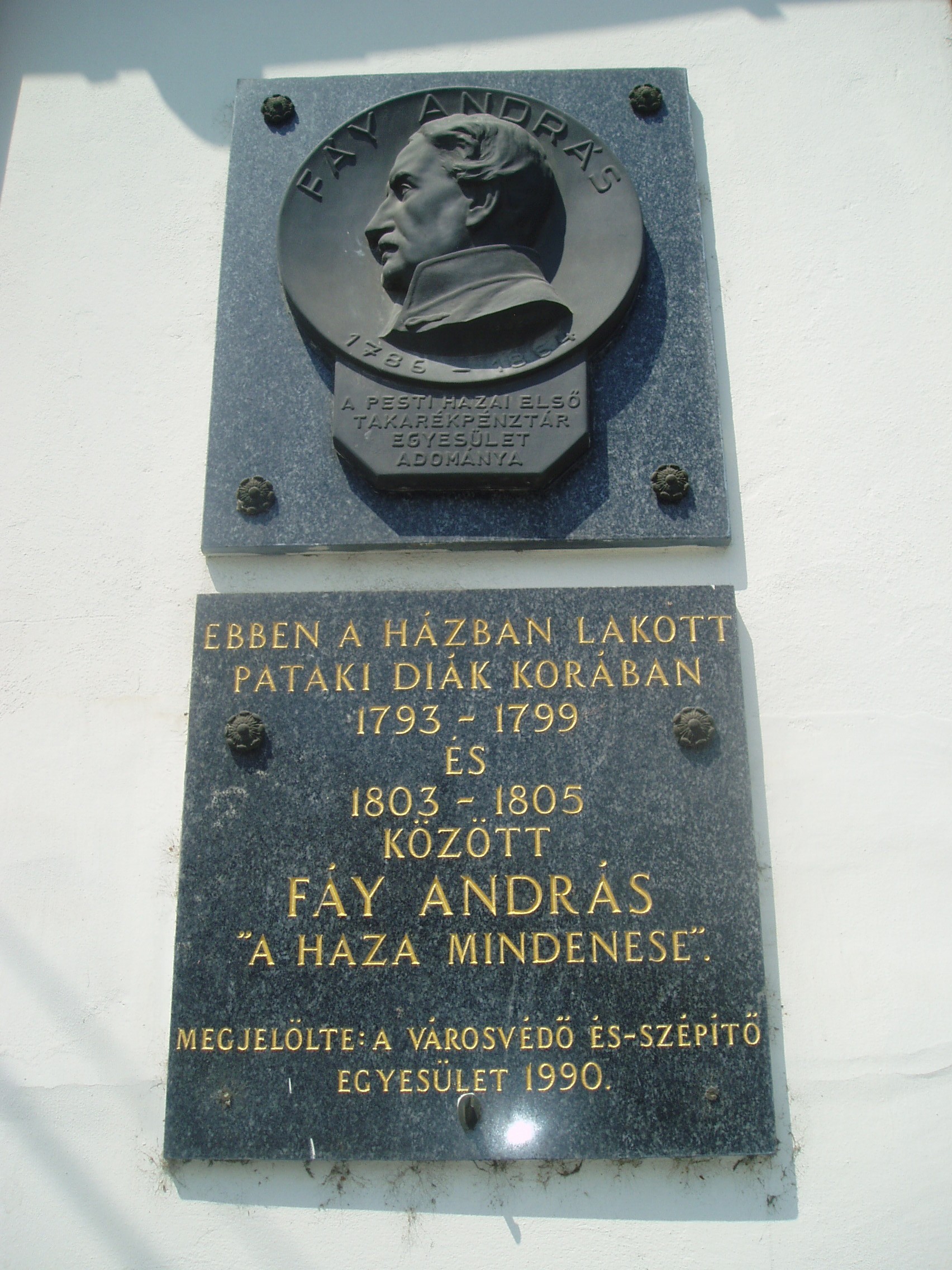 Nyilvános 1098 | 1747 | Sárospatak, Kossuth utca 22. | A homlokzatán 1990-ben elhelyezett emléktábla tanúsága szerint ebben a házban lakott pataki diák korában, 1793-1799 és 1803-1805 között Fáy András, "a haza mindenese", Alakját az Iskolakertben mellszobra idézi (lásd: Sárospatak, Iskolakert: Fáy András). A fénykép 2007 augusztusában készült. |