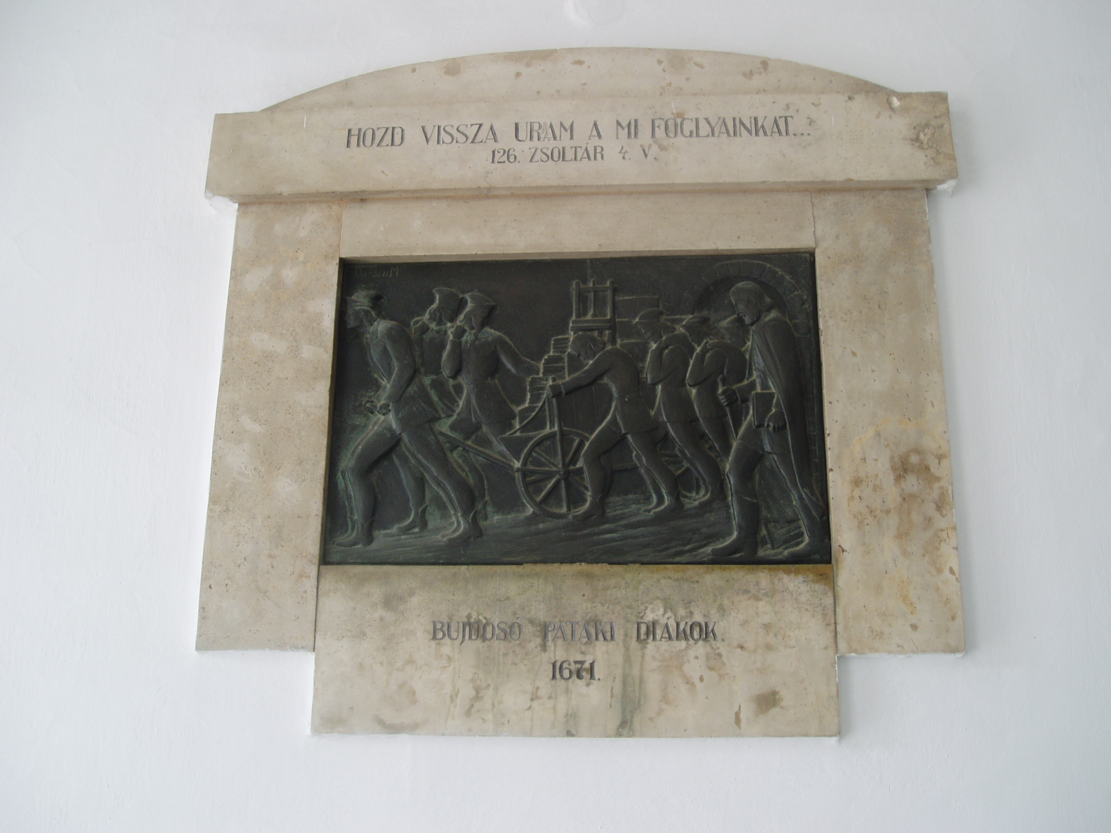Nyilvános 1096 | 1660 | Sárospatak, Rákóczi utca 1. Református Kollégium | A kollégium főépülete, a Nagy Kollégium a Rákóczi út északi végén található, mely 1804–1814 között korai klasszicista stílusban épült. Szép ráccsal ellátott, háromíves nyílású kapuzat vezet be az un. „nagyportá”-ba, amelyet két sor vaskos pillér három hajóra oszt. Kétoldalt a falakon az iskolatörténet néhány fontosabb eseményének, illetve a kollégium nagy alakjainak bronz domborművű ábrázolásait helyezték el. A képen a bujdosó pataki diákok emléktáblája látható. Az ellenreformáció idején, 1671-ben az iskolát — a jezsuiták késztetésére — erőszakkal megszüntették, tanárait és diákjait menekülésre kényszerítették. A professzorokat és diákokat Gyulafehérváron Apafi Mihály fogadta be. A Thököly–szabadságharc idején került vissza az iskola Patakra, azután újra menekülés következett Göncre, majd Kassára. Az ellenreformáció korának gályarab hitvallói közül huszonkettő pataki diák volt. A Kollégium 1703-tól működhetett ismét Patakon. Az 1938-ben felavatott dombormű alkotója Dabóczy Mihály. A fénykép 2007 augusztusában készült. Felh. irod.: Détsy Mihály: Sárospatak. Bp. Corvina, 1974 Látnivalók Borsod-Abaúj-Zemplén megyében. Miskolc, Well-PRess, 1995 www.sarospatak.hu/nevezetessegek |