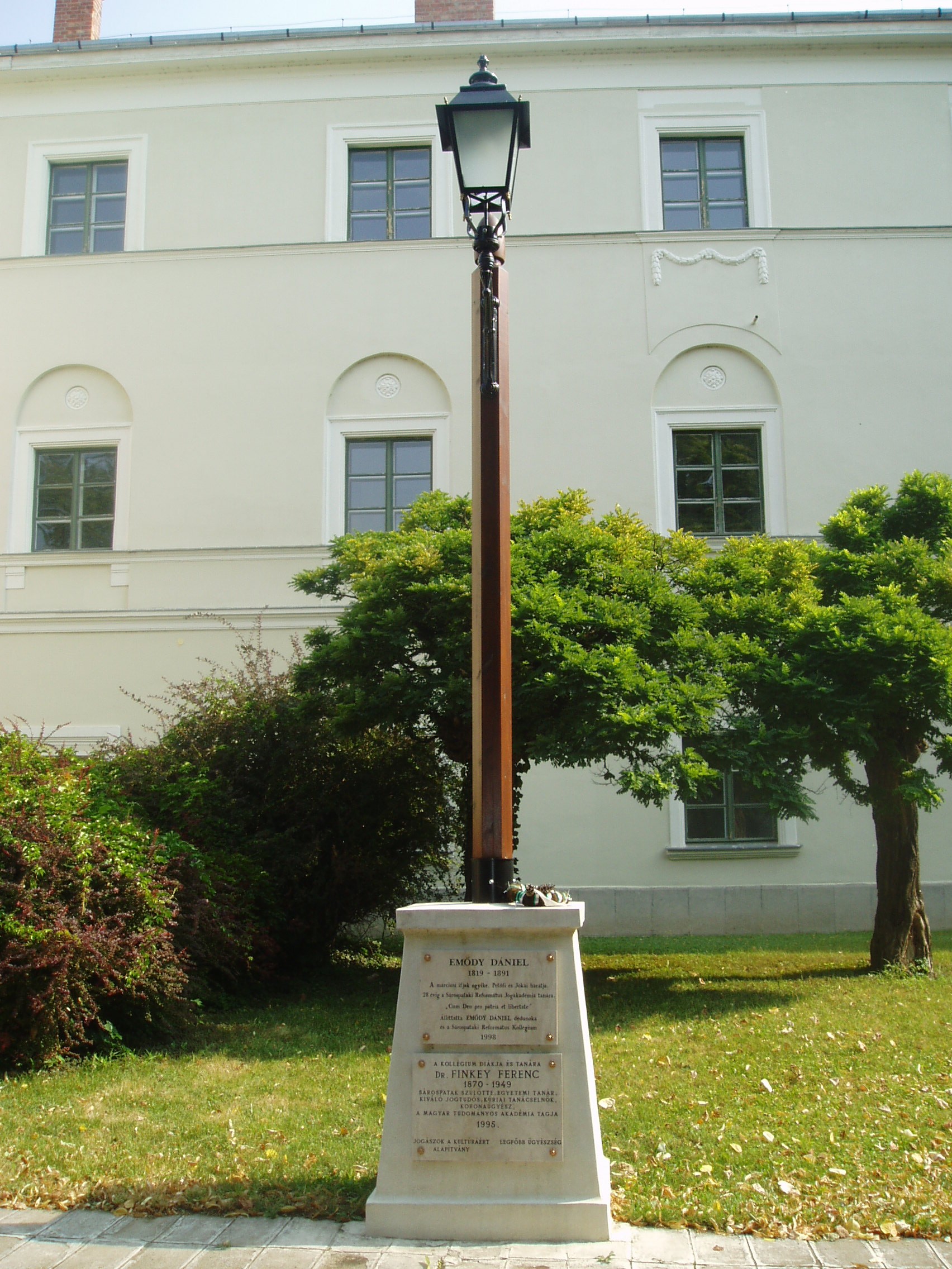 Nyilvános 1109 | 1632 | Sárospatak, Rákóczi utca 1. Református Kollégium | A kollégium főépülete, a Nagy Kollégium a Rákóczi út északi végén található, mely 1804–1814 között korai klasszicista stílusban épült. Szép ráccsal ellátott, háromíves nyílású kapuzaton át jut a látogató az udvarra. Az 1990-es évek közepétől helyeznek el emléktáblákat az itt felállított kandeláberek talapzatán. Az első emléktábla Emődy Dániel (1819-1891) alakját idézi. A márciusi ifjak egyike, Petőfi és Jókai barátja 28 évig volt a Református Jogakadémia tanára. A második táblát Dr. Finkey Ferenc (1870-1949) kiváló jogtudós, koronaügyész, egykori pataki diák emlékére állították. A fénykép 2007 augusztusában készült. Felh. irod.: Détsy Mihály: Sárospatak. Bp. Corvina, 1974 Látnivalók Borsod-Abaúj-Zemplén megyében. Miskolc, Well-PRess, 1995 www.sarospatak.hu/nevezetessegek |