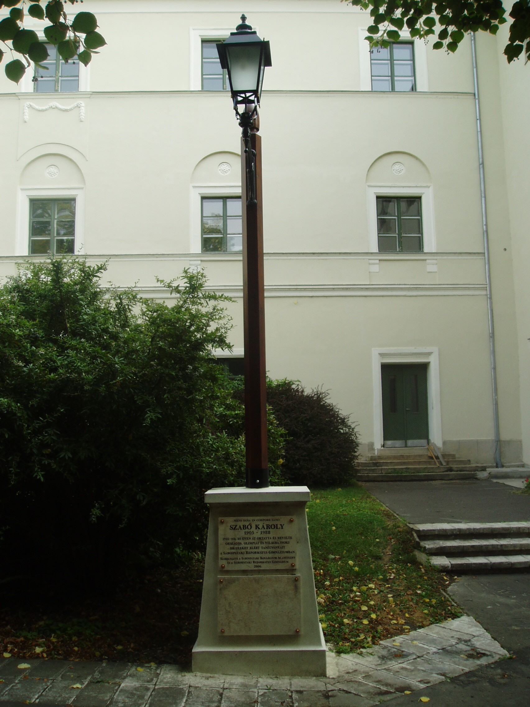 Nyilvános 1159 | 1642 | Sárospatak, Rákóczi utca 1. Református Kollégium | A kollégium főépülete, a Nagy Kollégium a Rákóczi út északi végén található, mely 1804–1814 között korai klasszicista stílusban épült. Szép ráccsal ellátott, háromíves nyílású kapuzaton át jut a látogató az udvarra. Az 1990-es évek közepétől helyeznek el emléktáblákat az itt felállított kandeláberek talapzatán. A képen látható táblát Szabó Károly (1905-1988) emlékére állították, aki 44 éven át oktatta és nevelte a pataki református gimnáziumban országos, olimpiai és világbajnoki eredményeket elért tanítványait. A fénykép 2007 augusztusában készült. Felh. irod.: Détsy Mihály: Sárospatak. Bp. Corvina, 1974 Látnivalók Borsod-Abaúj-Zemplén megyében. Miskolc, Well-PRess, 1995 www.sarospatak.hu/nevezetessegek |