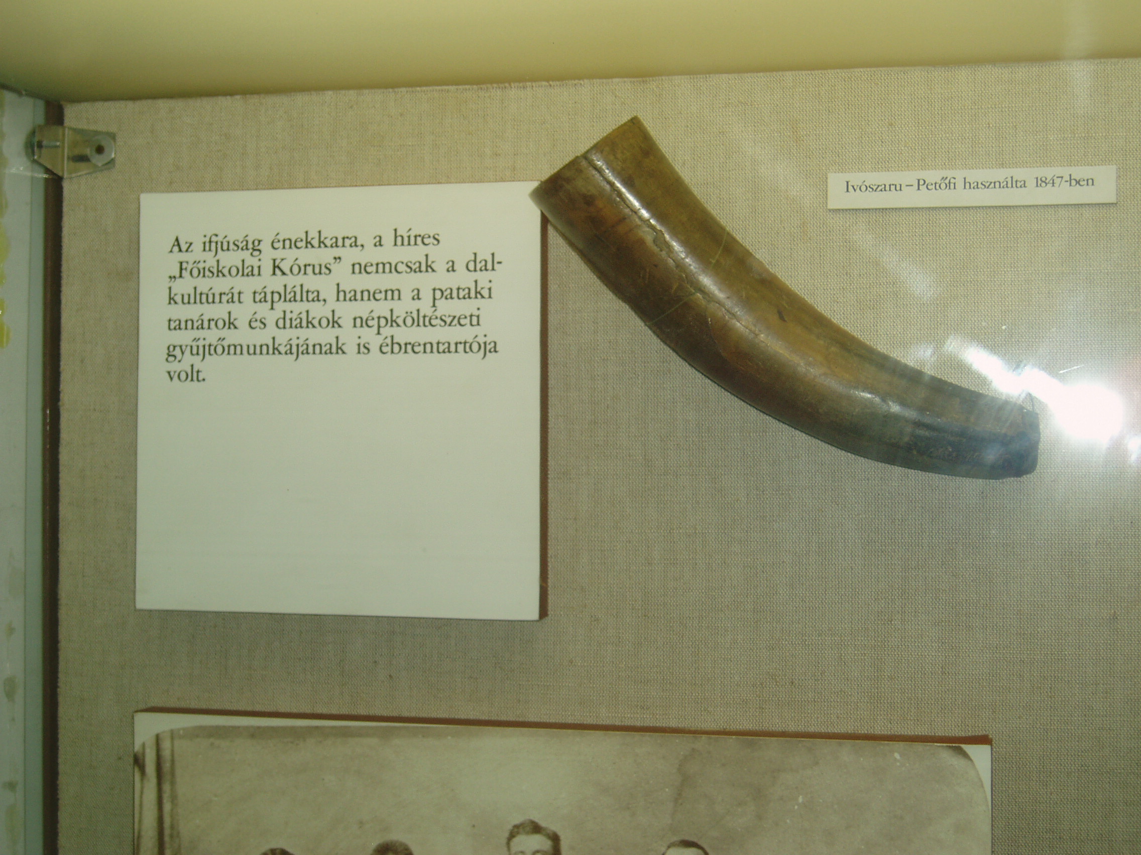 Nyilvános 1141 | 1553 | Sárospatak, Rákóczi utca 1. Református Kollégium | A Kollégium főépületének szárnyai által határolt tágas udvarban áll a régi iskolaépületek utolsó maradványa, az ún. Berna-sor. 1771/72-ben a fizika oktatása számára és a fizikaprofesszor lakásául épült. Az egyemeletes, hosszú szárny déli oldalát később kétszintes, árkádos tornáccal bővítették, feljáróval a nyugati oldalon. Az épület a korabeli provinciális magyar építészet szép példája. Az emelet boltozott termeiben a kollégium történetét bemutató kiállítást rendeztek be. A képen a Petőfi Sándor pataki látogatása alkalmából a költő által használt ivószaru látható. Petőfi 1847. július 9-én, útban menyasszonyához szállt meg Patakon. Vendéglátója Pálkövy Antal tanár volt (lásd: Sárospatak, Rákóczi utca 17.). A Kollégium énekkara vidám estét rendezett számára. A fénykép 2007 augusztusában készült. Felh. irod.: Détsy Mihály: Sárospatak. Bp. Corvina, 1974 |