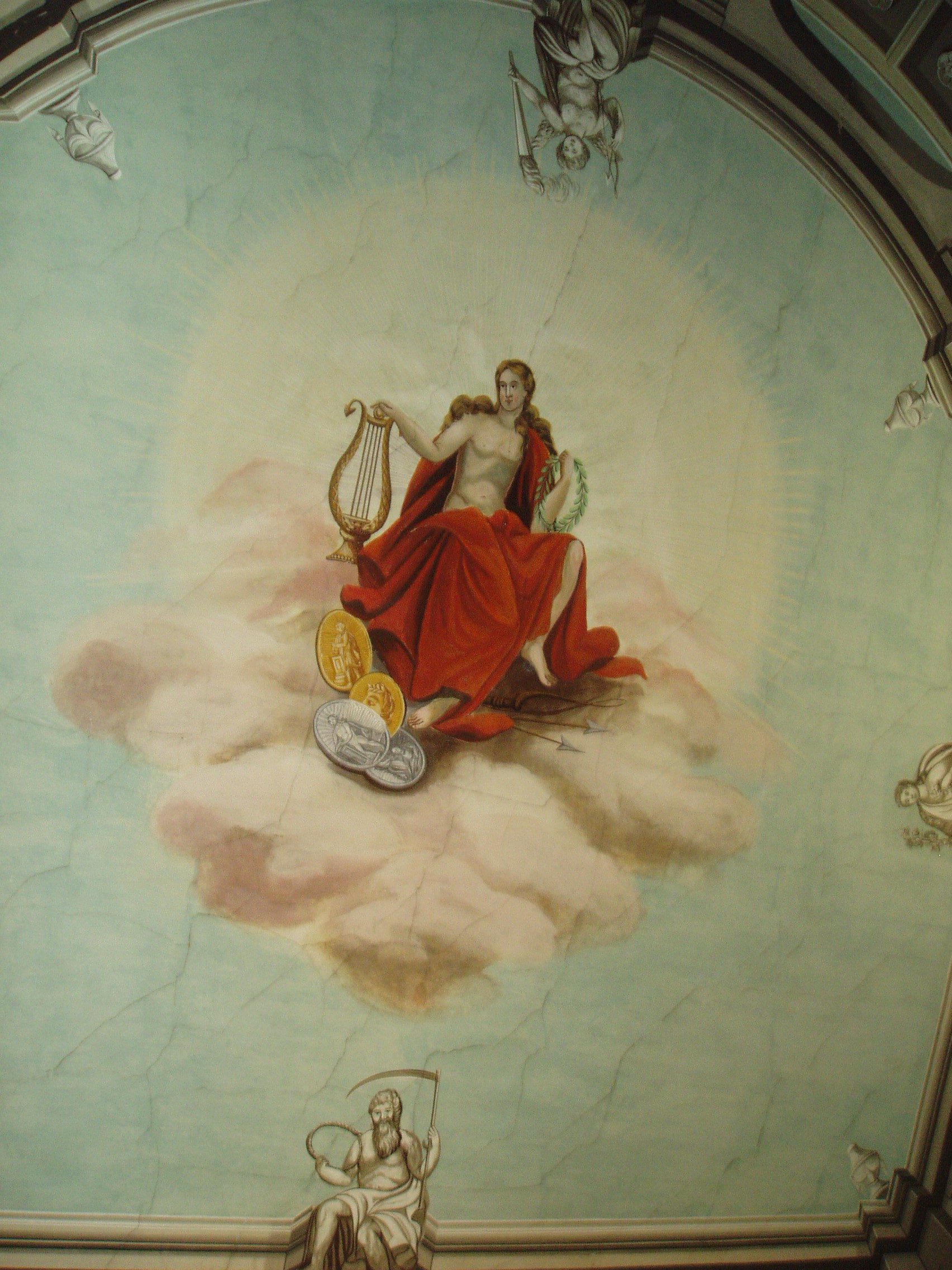Nyilvános 1119 | 1616 | Sárospatak, Rákóczi utca 1. A Református Kollégium Könyvtára | A Kollégium főépületének emeletén található az intézmény nevezetes könyvtára. A terem belső kiképzése 1834-re készült el egy "Pollack" aláírású terv alapján, ezért a magyar klasszicizmus nagy mesterének, Pollack Mihálynak tulajdonítják a pompás interieurt. Az elnyújtott, két emeletet egybefoglaló termet fából épült dór oszlopsor veszi körül, amelynek gerendázata galériát tart. A falak mellett az oszlopsoron és a galérián belül XIX. századi könyvállványok hordozzák a nagy értékű könyvgyűjteményt. A terem padlózata csillagmintás berakású táblás parketta. A múzsát ábrázoló mennyezetfreskó Lintzbauer József kassai festő alkotása. A fénykép 2007 augusztusában készült. Felh. irod.: Détsy Mihály: Sárospatak. Bp. Corvina, 1974 www.gradatio.hu/nagykonyvtar |