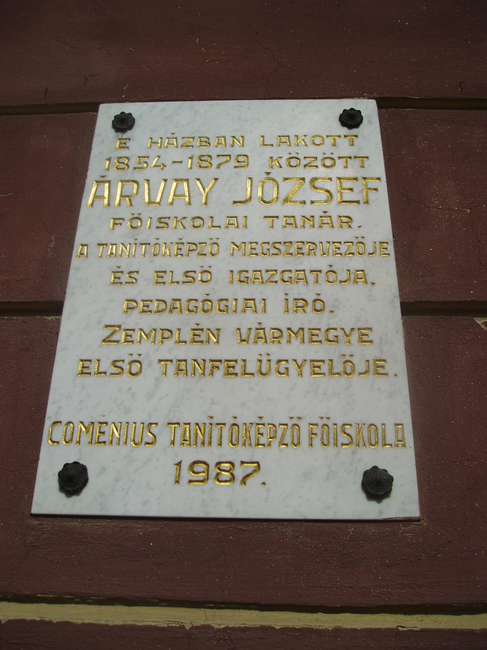 Nyilvános 1110 | 1622 | Sárospatak, Rákóczi utca 12. | A műemlék jellegű lakóház a XIX. század első felében épült későbarokk stílusban. 1854 és 1879 között itt lakott Árvay József (1823-1879) matematika szakos főiskolai tanár, korábbi pataki diák. Ő volt az 1859-ben felállított taítóképző intézet első igazgatója és Zemplén vármegye első tanfelügyelője. Tankönyvírással is foglalkozott. A fénykép 2007 augusztusában készült. Felh. irod.: www.wikipedia.org |