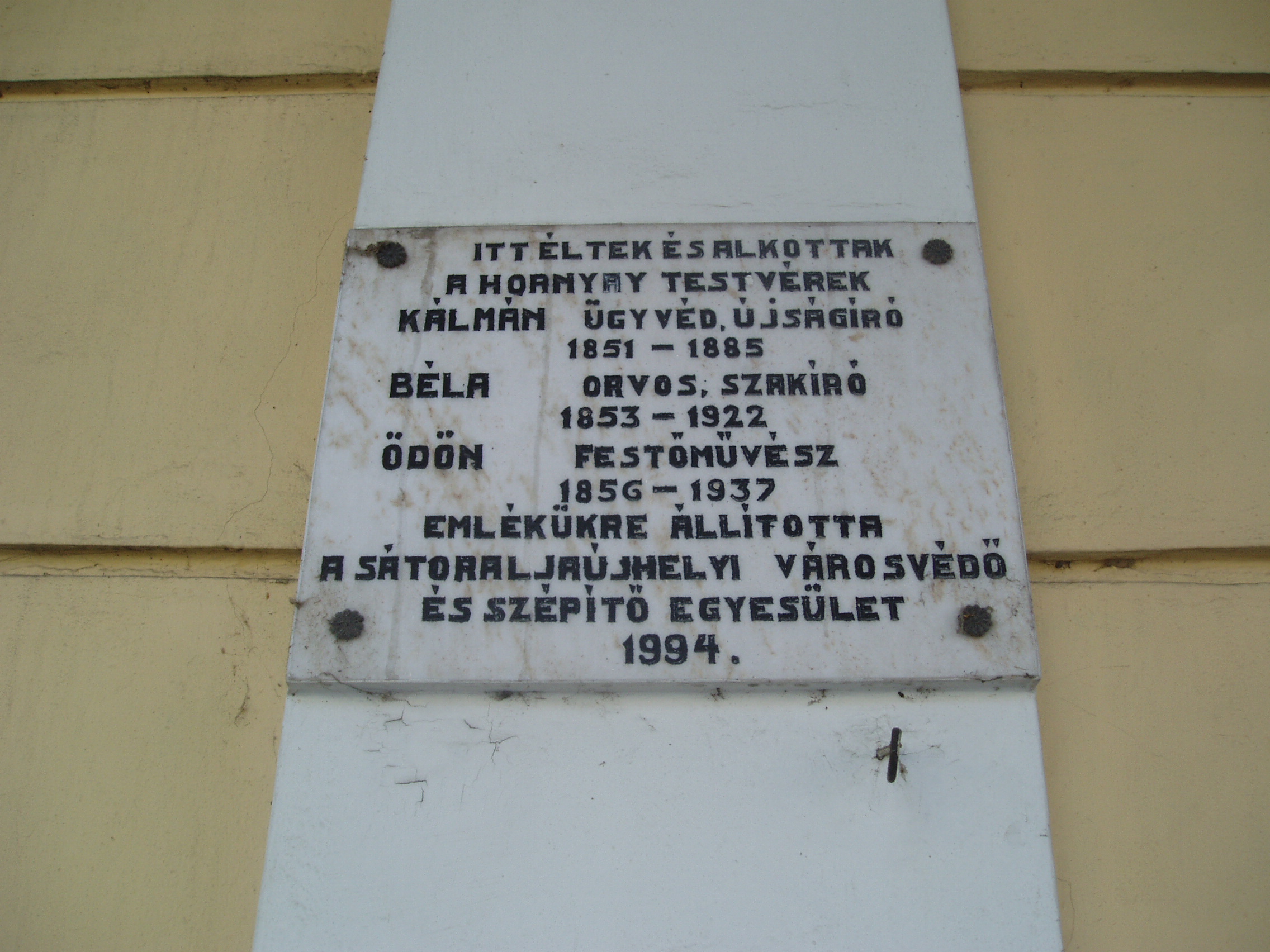 Nyilvános 1144 | 1625 | Sátoraljaújhely, Táncsics tér 2. | Mint az emeletes városi házon elhelyezett emléktáblán olvasható, itt éltek a Hornyay-testvérek. Hornyay Kálmán (1851-1885) ügyvéd, újságíró, Hornyay Béla orvos (1853-1922), Hornyay ödön (1856-1937) pedig festőművész volt. A fénykép 2007 augusztusában készült. |