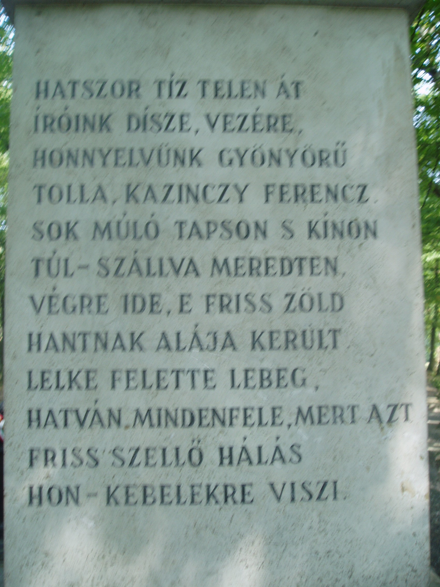 Nyilvános 1118 | 1708 | Széphalom: A Kazinczy család sírkertje - Kazinczy Ferenc sírja | A Kazinczy Emlékcsarnok parkja - Kazinczy Ferenc egykori kúriájának kertje - ma természetvédelmi terület. A mauzóleumból fasor vezet a Kazinczy család sírkertjébe. A sírkert helyét 1806-ban, első gyermeke, az egyéves korában elhunyt Iphigenia halálakor Kazinczy maga jelölte ki. Már akkor megírta barátainak, hogy felesége és ő is oda fognak temetkezni. Kazinczy Ferenc 1831. augusztus 22-én hunyt el széphalmi otthonában. Sírja már a reformkorban zarándokhely lett. Járt itt Petőfi Sándor is 1847. júliusában. Az emlékoszlop alatt nyugszik az író és felesége, az oszlop körül pedig négy gyermekük, két unokájuk, három dédunokájuk és az a szolgálójuk, aki Kazinczyval együtt raboskodott Munkács várában. Legkisebbik fiuk, Lajos, Aradon szenvedett vértanúhalált a honvédsereg ezredeseként. A fénykép 2007 augusztusában készült. Felh. irod.: Látnivalók Borsod-Abaúj-Zemplén megyében. Miskolc, Well-PRess, 2004 www.vendegvaro.hu Busa Margit: Adalékok a Kazinczy család történetéhez. = Széphalom. A Kazinczy Ferenc Társaság Évkönyve 12. kötet, 2002 |