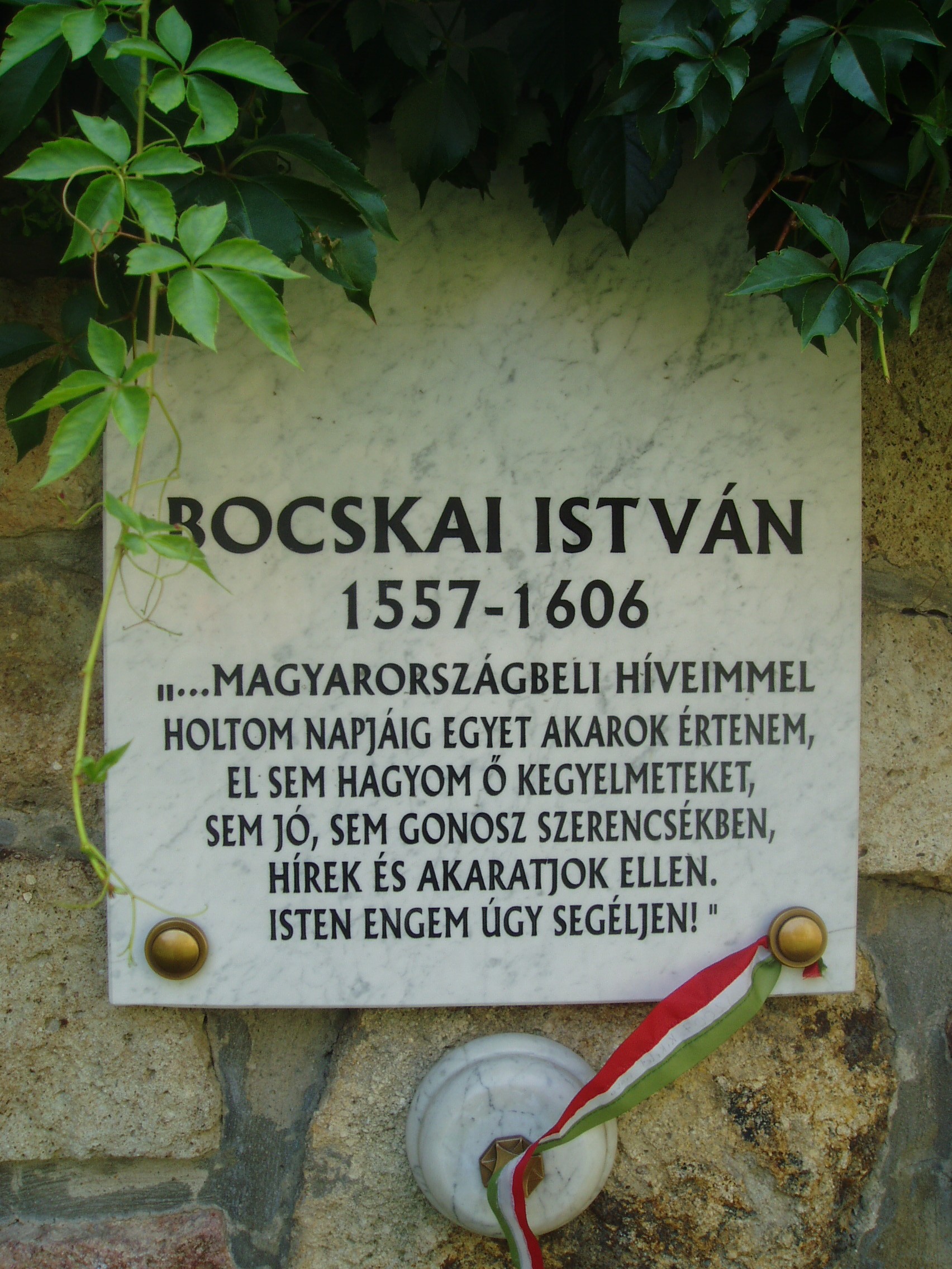 Nyilvános 1062 | 1558 | Szerencs, Huszárvár utca 11. Zempléni Panteon: Bocskai István (1544-1606) emléktáblája | A szerencsi Rákóczi várnál 1996-ban, a honfoglalás ezredeik évfordulója alkalmából állították fel a jeles zempléni személyiségek panteonját. Bocskai Istvánt a szerencsi református templomban (lásd: Szerencs, Kossuth tér 4.) 1605. április 17. és 20. között megtartott nemzetegyesítő országgyűlésen választották Magyarország fejedelmévé. Ezen az országgyűlésen mondták ki a protestánsok vallásszabadságát. Bocskai 1606. március 9-én szabad királyi várossá emelte Szerencset, s lakosainak jelentős kiváltságokat adott. A fénykép 2007 augusztusában készült. Felh. irod.: Fazekas Lászlóné: Szerencs. Szerencs, Szerencsi Hírek Szerkesztősége, 1997 |