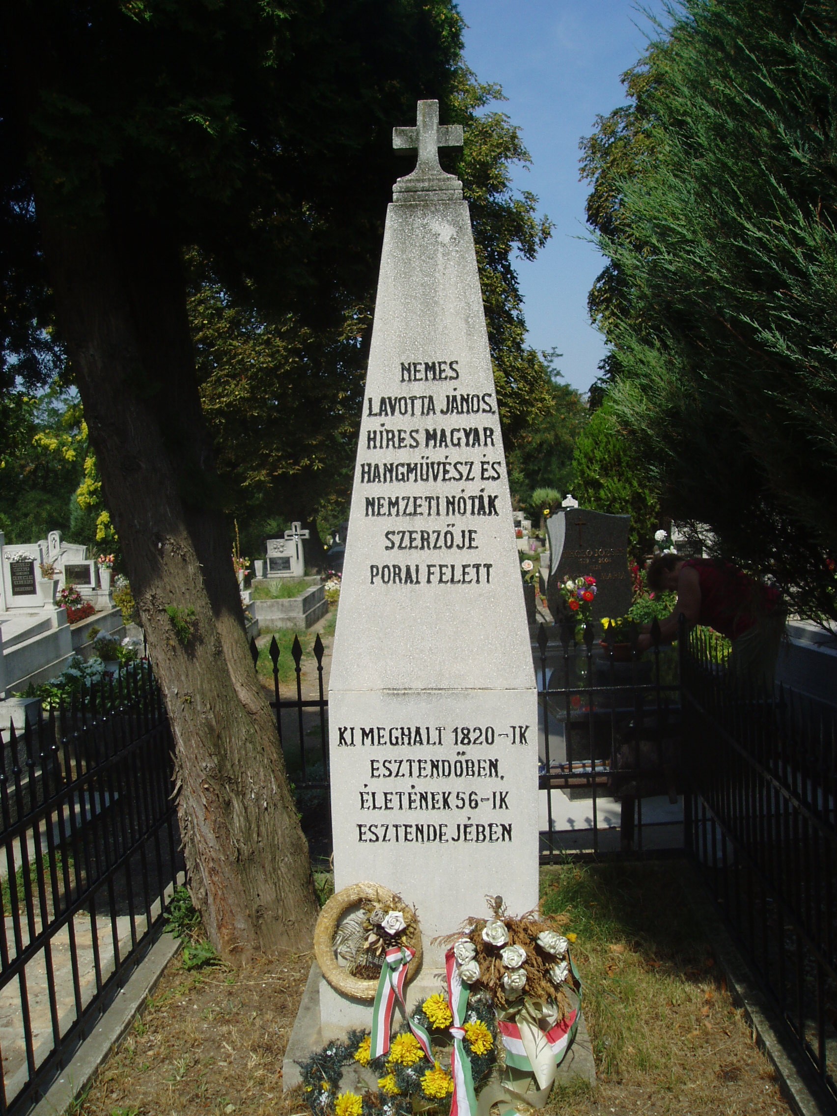 Nyilvános 1238 | 2247 | Tállya, Temető: Lavotta János sírja | Az 1820. augusztus 11-én - családtalanul - Tállyán elhunyt (lásd: Tállya, Rákóczi u. 24.) Lavotta Jánost nagy pompával, több vármegye urának részvételével helyezték örök nyugalomra a helyi temetőben. A hagyomány szerint hegedűjét is koporsójába tették. Temetésén zenekarával a verbunkos másik kiemelkedő képviselője, Bihari János játszott. Síremlékét, amely ma helyreállított állapotban látható, 1831-ben egy tisztelője, Újfalussy Mihály emelte. A verbunkos-triász egyik nagy mesterének tiszteletére a közelmúltban a Maillot-kastélyban emlékszobát rendeztek be (lásd: Tállya, Rákóczi u. 10.). Emlékét a település központjában felállított obeliszk (lásd: Tállya, Rákóczi u. 34.) is őrzi. A fénykép 2007 augusztusában készült. Felh. irod.: Szilágyi Sándor: Lavotta János. Bp. 1930. Dombóvári János: Pusztafedémestől Tállyáig. Miskolc, Szent Maximilian Kiadó, 1994 www.tallya.hu Takács Péter: Tállya. Bp. Száz Magyar Falu Könyvesháza Kht., 2001. /Száz magyar falu könyvesháza/ |
