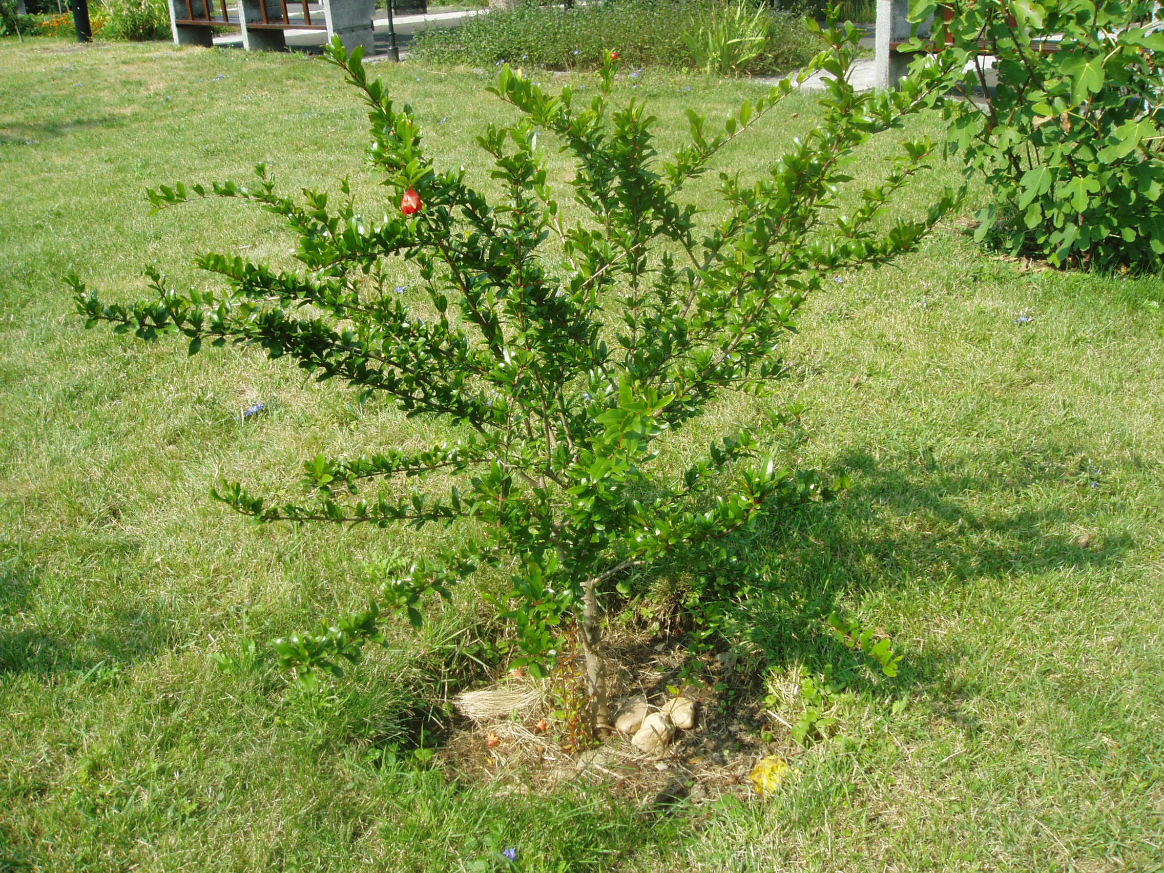 Nyilvános 1131 | 1649 | Sárospatak, Rákóczi utca 1. Református Kollégium | A Kollégium udvarán, a Berna-sor előtt alakították ki a Bibliai kertet. Mintegy ötven féle, a Bibliában említett növény található itt. Az eligazodást alaprajz és a növények jegyzéke segíti. A képen egy kis gránátalmafa látható. A fénykép 2007 augusztusában készült. |